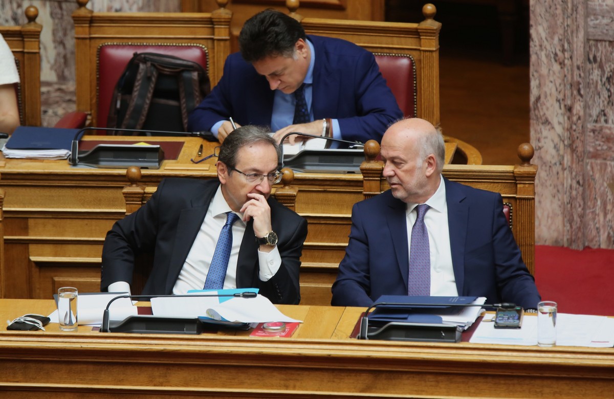 Ο υπουργός Δικαιοσύνης Γιώργος Φλωρίδης (Δ) συνομιλεί με τον υφυπουργό Δικαιοσύνης Ιωάννη Μπούγα (Α) κατά την διάρκεια της συζήτησης και ψήφισης του νομοσχεδίου του υπουργείου Δικαιοσύνης: «Ενοποίηση του πρώτου βαθμού δικαιοδοσίας, χωροταξική αναδιάρθρωση των δικαστηρίων της πολιτικής και ποινικής δικαιοσύνης και λοιπές ρυθμίσεις του Υπουργείου Δικαιοσύνης» στην αίθουσα της Ολομέλειας στη Βουλή, Μ. Τρίτη 30 Απριλίου 2024. ΑΠΕ- ΜΠΕ/ΑΠΕ- ΜΠΕ/ΑΛΕΞΑΝΔΡΟΣ ΒΛΑΧΟΣ