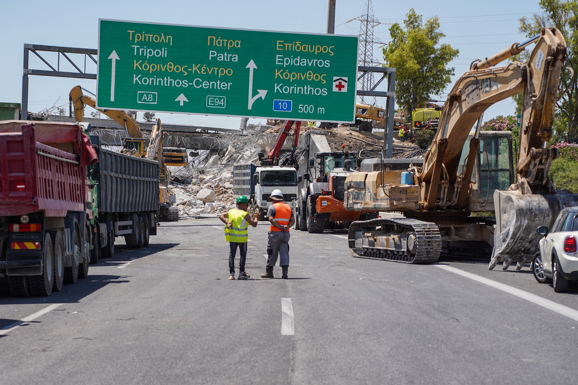 Demolition works of a damaged bridge on the National Road of Athens-Corinth following a blast caused by a truck carrying fuel. in Corinth, Greece, on June 8, 2024 / Κατεδάφιση της γέφυρας της παλαιάς εθνικής οδού στο ύψος του Ισθμού έπειτα απο εκτεταμένες ζημιές που υπέστη απο έκρηξη φορτηγού οχήματος που μετέφερε καύσιμα, στην Κόρινθο, στις 8 Ιουνίου, 2024