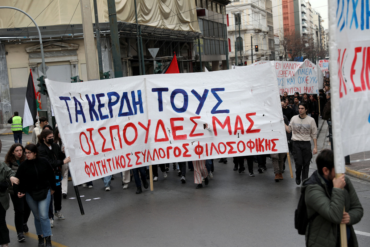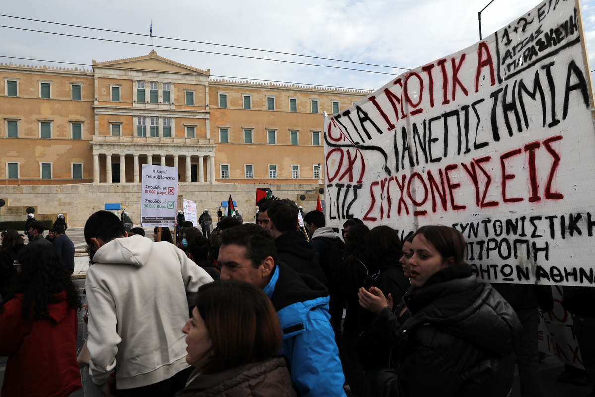 Συγκεκριμένα, από τις 12 το πρωί της Πέμπτης (25/1), εκατοντάδες φοιτητές και μαθητές με τα πανό τους συγκεντρώθηκαν στα Προπύλαια, απ’ όπου ξεκίνησε και η πορεία προς την πλατεία Συντάγματος.