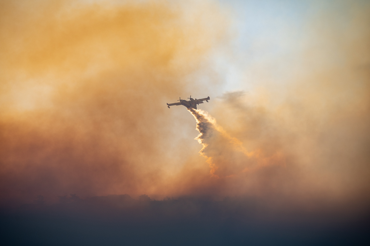 Αεροπλάνο Canadair ενεργεί σε πυρκαγιά που καίει δασική έκταση στη Χίο, Τρίτη 24 Ιουνίου 2025. Με αμείωτη ένταση συνεχίζουν να δίνουν μάχη με τις φλόγες οι πυροσβεστικές δυνάμεις στη Χίο. Καθ' όλη τη διάρκεια της νύχτας ισχυρές επίγειες δυνάμεις επιχειρούσαν έχοντας επικεντρωθεί, όπως έγινε γνωστό από την Πυροσβεστική, στο κομμάτι που είναι στα δυτικά- νοτιοδυτικά της πόλης της Χίου προς Δαφνώνα και Άγιο Γεώργιο Συκούση, προκειμένου να περιορίσουν τις εστίες φωτιάς καθώς και τις αναζωπυρώσεις. Στο σημείο επιχειρούν 444 πυροσβέστες καθώς έχουν φτάσει όλες οι ενισχύσεις από Αθήνα, Θεσσαλονίκη, Καβάλα και Λέσβο, με 21 ομάδες δασοκομάντο, 85 οχήματα καθώς και 30 εθελοντές -πεζοπόρα τμήματα- με 4 εθελοντικά οχήματα. Παράλληλα, τρία μηνύματα μέσω του 112 έχουν σταλεί, από τα μεσάνυχτα μέχρι τις 7.30 το πρωί, καλώντας τους κατοίκους να απομακρυνθούν από τους οικισμούς Λιθί (και την παραλία Λιθί) και Βέσσα Χίου. Σημειώνεται ότι, όπως ανακοινώθηκε χθες, η Χίος έχει κηρυχθεί σε κατάσταση έκτακτης ανάγκης Πολιτικής Προστασίας. ΑΠΕ-ΜΠΕ/ΑΠΕ-ΜΠΕ/ΚΩΣΤΑΣ ΚΟΥΡΓΙΑΣ