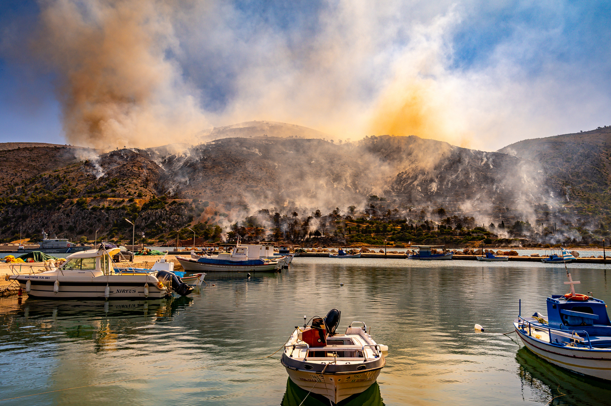 Δεμένες βάρκες στο λιμάνι Λιθίου στη Χίο, ενώ πυρκαγιά καίει δασική έκταση, Τρίτη 24 Ιουνίου 2025. ΑΠΕ-ΜΠΕ/ΚΩΣΤΑΣ ΚΟΥΡΓΙΑΣ