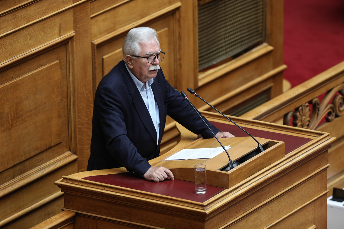 Ο βουλευτής του ΚΚΕ Χρήστος Κατσώτης μιλάει στην Ολομέλεια της Βουλής κατά τη διάρκεια ανάγνωσης και συζήτησης επί των Προγραμματικών Δηλώσεων της Κυβέρνησης, Αθήνα, Παρασκευή 07 Ιουλίου 2023. Η διαδικασία θα ολοκληρωθεί το βράδυ του Σαββάτου, 08 Ιουλίου, με την ονομαστική ψηφοφορία για την παροχή ψήφου εμπιστοσύνης στην κυβέρνηση. ΑΠΕ-ΜΠΕ/ΑΠΕ-ΜΠΕ/ΓΙΩΡΓΟΣ ΒΙΤΣΑΡΑΣ