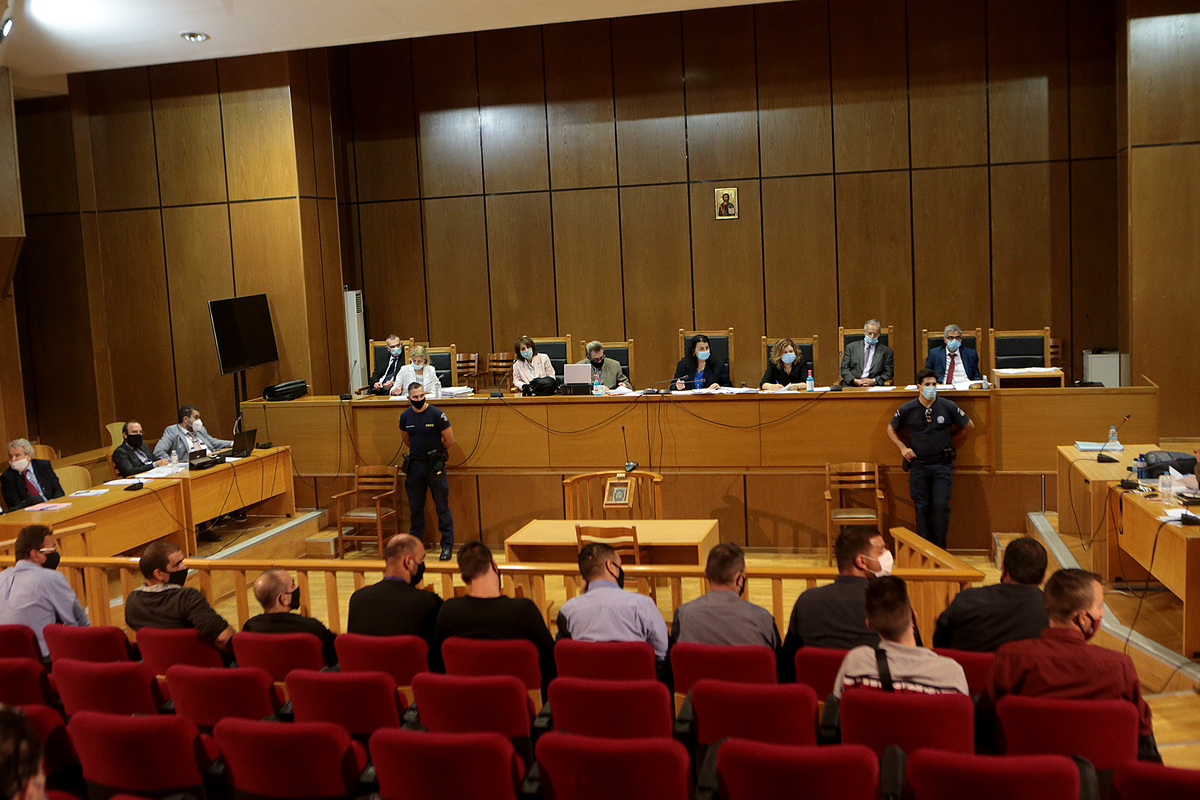 Η πρόεδρος Μαρία Λεπενιώτη (Κ) και τα μέλη του δικαστηρίου στην έδρα όπου συνεχίζεται η διαδικασία με τις αγορεύσεις των συνηγόρων υπεράσπισης για την αναγνώριση ελαφρυντικών, μετά την ανακοίνωση της απόφασης του δικαστηρίου στη δίκη της Χρυσής Αυγής, στο Εφετείο Αθηνών, Αθήνα, Τετάρτη 07 Οκτωβρίου 2020. Ομόφωνα η ελληνική Δικαιοσύνη αποφάνθηκε ότι η Χρυσή Αυγή είναι εγκληματική οργάνωση «ενδεδυμένη με τον μανδύα πολιτικού κόμματος», σύμφωνα με το παραπεμπτικό βούλευμα της υπόθεσης. Η απόφαση του δικαστηρίου δίνει πολλά μηνύματα, τόσο αποδεχόμενη τη ναζιστική φύση της οργάνωσης όσο και για τα ιδεολογικά κίνητρα με τα οποία κινήθηκαν τα μέλη της. Σύμφωνα με τη δικαστική απόφαση, η οποία έχει πολλαπλό αντίκτυπο στην κοινωνική και πολιτική σκηνή της χώρας, επτά πρώην βουλευτείς της ΧΑ κρίθηκαν ένοχοι για διεύθυνση εγκληματικής οργάνωσης. Νωρίτερα, οι δικαστές επίσης ομόφωνα έκριναν ένοχο για την υπόθεση της δολοφονίας του Παύλου Φύσσα τον καθ' ομολογία δολοφόνο Γιώργο Ρουπακιά και 15 ακόμη από τους συνολικά 18 κατηγορούμενους για τη συγκεκριμένη εγκληματική πράξη. Για την απόπειρα