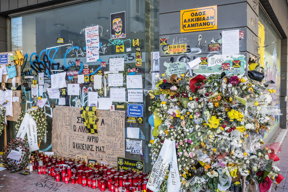 (Ξένη Δημοσίευση) Αφιερώματα στο σημείο δολοφονίας του 19χρονου Άλκη, κατά τη διάρκεια της επίσκεψης της Προέδρου της Δημοκρατίας Κατερίνας Σακελλαροπούλου, Θεσσαλονίκη, Παρασκευή 18 Φεβρουαρίου 2022. ΑΠΕ-ΜΠΕ/ΠΡΟΕΔΡΙΑ ΤΗΣ ΔΗΜΟΚΡΑΤΙΑΣ/ΘΟΔΩΡΗΣ ΜΑΝΩΛΟΠΟΥΛΟΣ