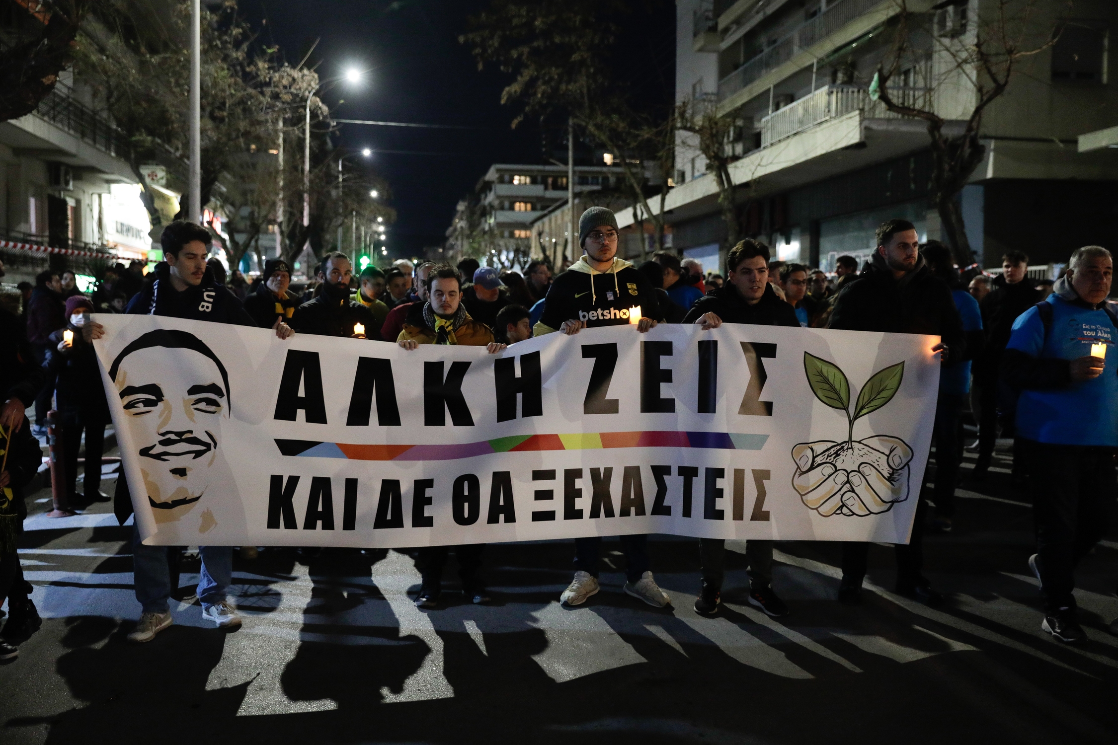 Σιωπηρή πορεία μνήμης για τον Άλκη Καμπανό, από το σημείο της δολοφονίας έως τον Λευκό Πύργο, στο κέντρο της Θεσσαλονίκης, 1 Φεβρουαρίου 2023.