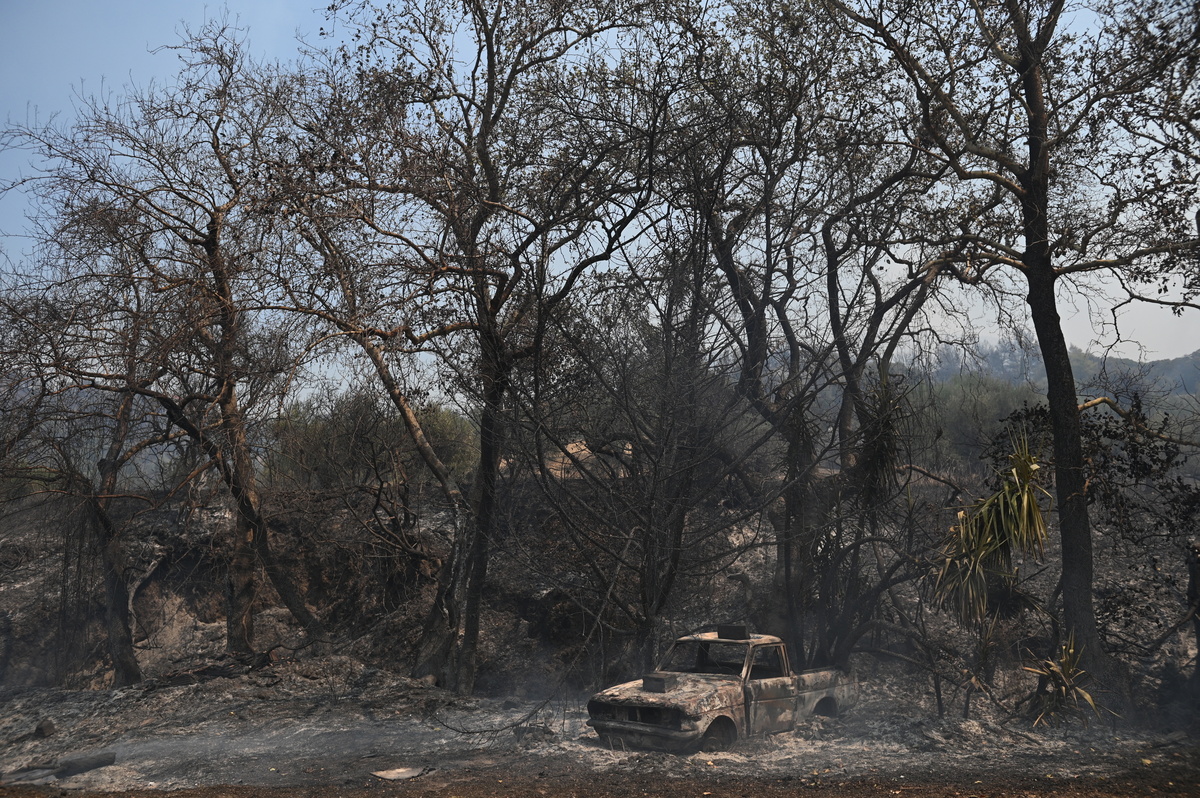 epa12298891 A burnt car during a wildfire in Vounteni village, Achaia, Peloponnese, Greece, 13 August 2025. Firefighting forces are battling 109 fires across the country, with 48 new forest fires reported in the last 24 hours, 38 of which were dealt with immediately. EPA/GIOTA LOTSARI