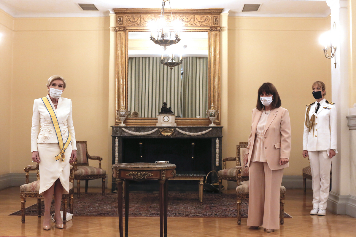 Η Πρόεδρος της Δημοκρατίας Κατερίνα Σακελλαροπούλου (Δ) και η Πρέσβης Καλής Θελήσεως της UNESCO Μαριάννα Βαρδινογιάννη (Α), κατά τη διάρκεια της τελετής επίδοσης του Παράσημου του Μεγαλόσταυρου του Τάγματος της Ευποιίας, στο Προεδρικό Μέγαρο Αθήνα, Τετάρτη 9 Σεπτεμβρίου 2020. ΑΠΕ-ΜΠΕ/ΚΩΣΤΑΣ ΤΣΙΡΩΝΗΣ