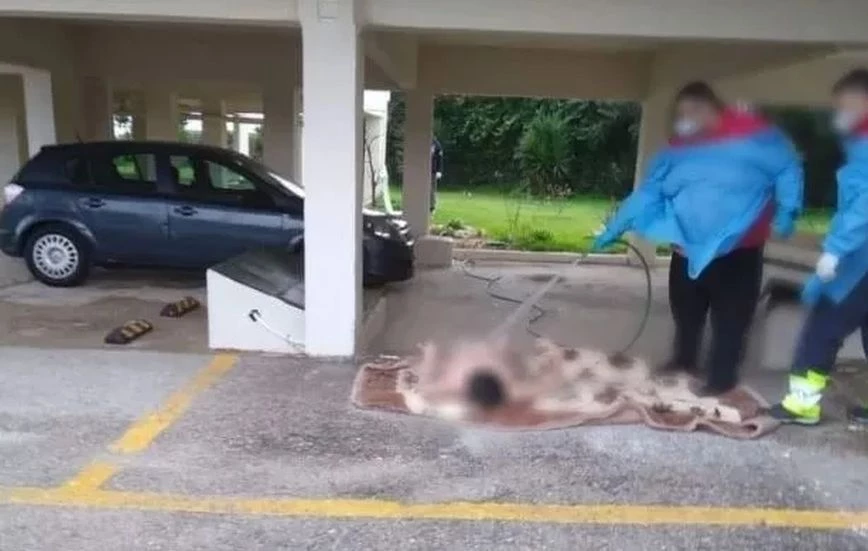 Οργή και αγανάκτηση προκαλεί η εικόνα από τον Ωρωπό, στην οποία φαίνονται νοσηλευτές να βρέχουν με λάστιχο σε πυλωτή πολυκατοικίας μία 70χρονη ασθενή. Στη φωτογραφία φαίνονται οι δύο νοσηλευτές να πλένουν την ηλικιωμένη γυναίκα, η οποία φέρεται να αντιμετωπίζει ψυχιατρικά προβλήματα, ολόγυμνη και ξαπλωμένη στην πυλωτή.
