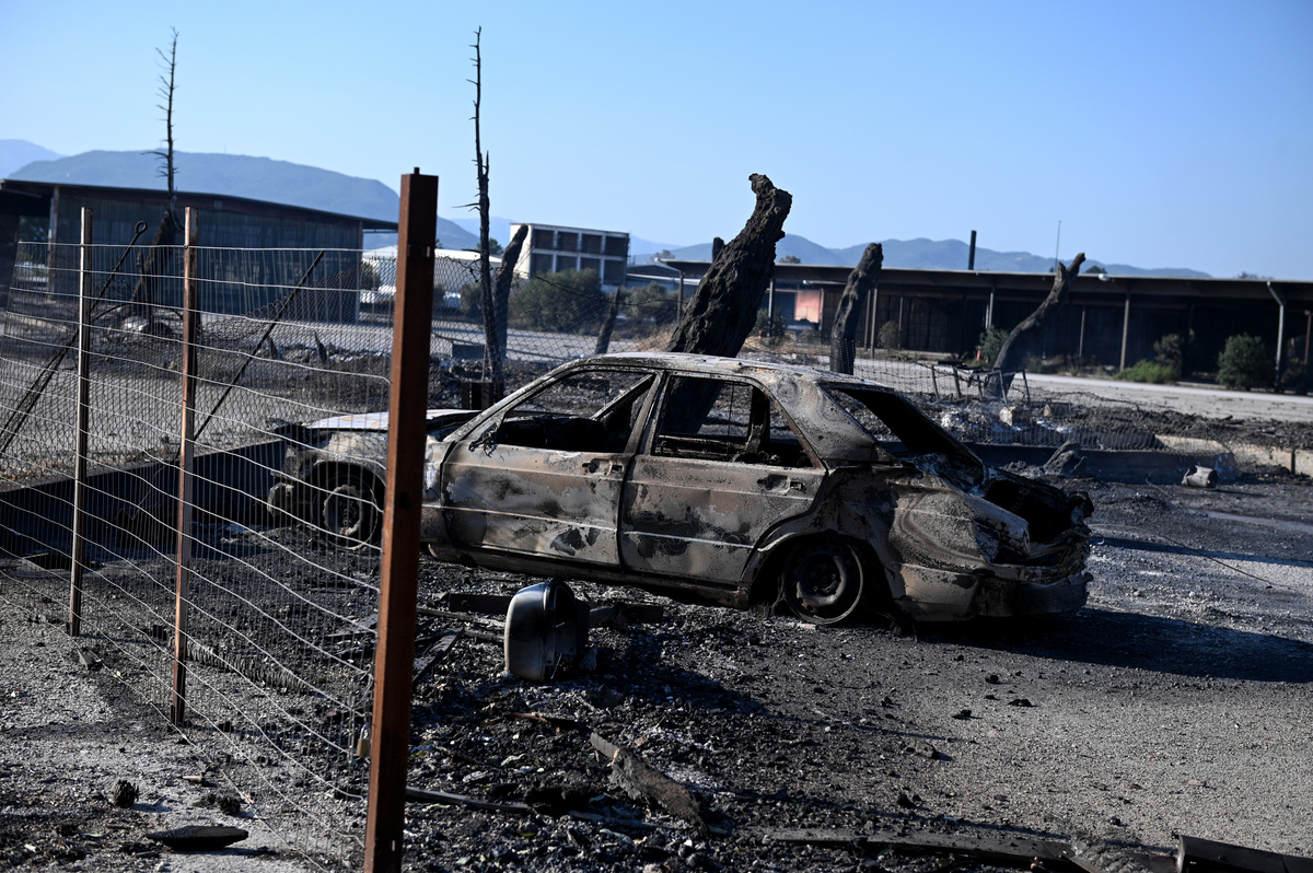 Καμένες εγκαταστάσεις εργοστασιακής μονάδας από τη χθεσινή φωτιά που ξέσπασε στη Βιομηχανικη Περιοχή της Πάτρας, Τετάρτη 13 Αυγούστου 2025. Περιορισμένες φαίνεται να είναι οι ζημιές που προκλήθηκαν σε εγκαταστάσεις της ΒΙ.ΠΕ. Πατρών, σύμφωνα με τον πρόεδρο του Συνδέσμου Εγκατεστημένων Επιχειρήσεων, κ. Δημήτρη Λειβαδάρο που μίλησε στο ΑΠΕ-ΜΠΕ. Ο κ. Λειβαδάρος ανέφερε ότι «από την πυρκαγιά που εισήλθε στους χώρους της ΒΙ.ΠΕ. έχει καταστραφεί ένα εγκαταλειμμένο εργοστάσιο καθώς και ένας αποθηκευτικός χώρος με λιπάσματα». Σε εξέλιξη εξακολουθούν να βρίσκονται οι πυρκαγιές στις περιοχή Συχαινών Πάτρας και στην Δυτική Αχαΐα. ΑΠΕ ΜΠΕ/ΑΠΕ ΜΠΕ/ΓΙΩΤΑ ΛΟΤΣΑΡΗ