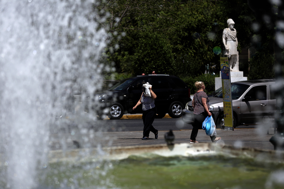 Μία γυναίκα τυλίγει το κεφάλι με ένα ύφασμα για να προστατευθεί από τον δυνατό ήλιο στην πλατεία Κοτζιά, Αθήνα, την Παρασκευή 30 Ιουνίου 2017. Με καύσωνα και υψηλές θερμοκρασίες που θα αγγίξουν τους 42 και πιθανόν 43 βαθμούς Κελσίου φεύγει ο Ιούνιος. Για δεύτερη μέρα ο υδράργυρος «χτυπάει κόκκινο» προκαλώντας αποπνικτική ατμόσφαιρα, κυρίως στα μεγάλα αστικά κέντρα. ΑΠΕ-ΜΠΕ/ΑΠΕ-ΜΠΕ/ΣΥΜΕΛΑ ΠΑΝΤΖΑΡΤΖΗ