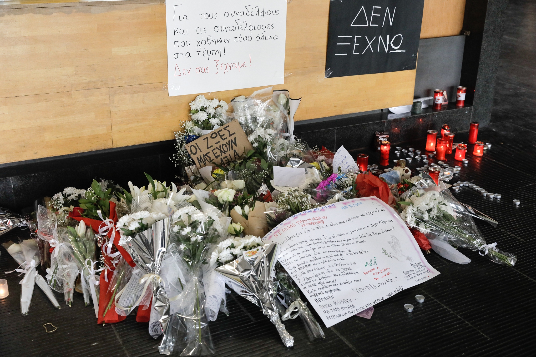 Flowers and candles lie, in the memory of the dozens of victims of the Greece's deadliest rail accident, at the main train station in Thessaloniki, Greece on March 3, 2023. / Λουλούδια και κεριά στη μνήμη των δεκάδων θυμάτων του πιο θανατηφόρου σιδηροδρομικού δυστυχήματος στην Ελλάδα, στον κεντρικό σιδηροδρομικό σταθμό της Θεσσαλονίκης, στις 3 Μαρτίου 2023.
