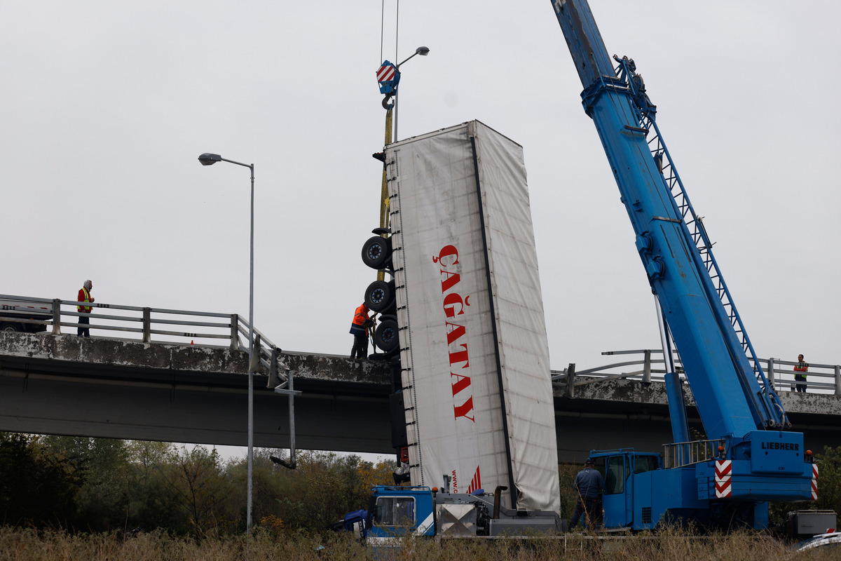 Γερανός απομακρύνει την νταλίκα που έπεσε από γέφυρα αφού προσέκρουσε στις μεταλλικές μπάρες, ενώ κινούνταν στην Εξωτερική Περιφερειακή Οδό στο ύψος του Καλοχωρίου, Θεσσαλονίκη, Τετάρτη 22 Νοεμβρίου 2023. ΑΠΕ-ΜΠΕ/ΑΠΕ-ΜΠΕ/ΑΧΙΛΛΕΑΣ ΧΗΡΑΣ