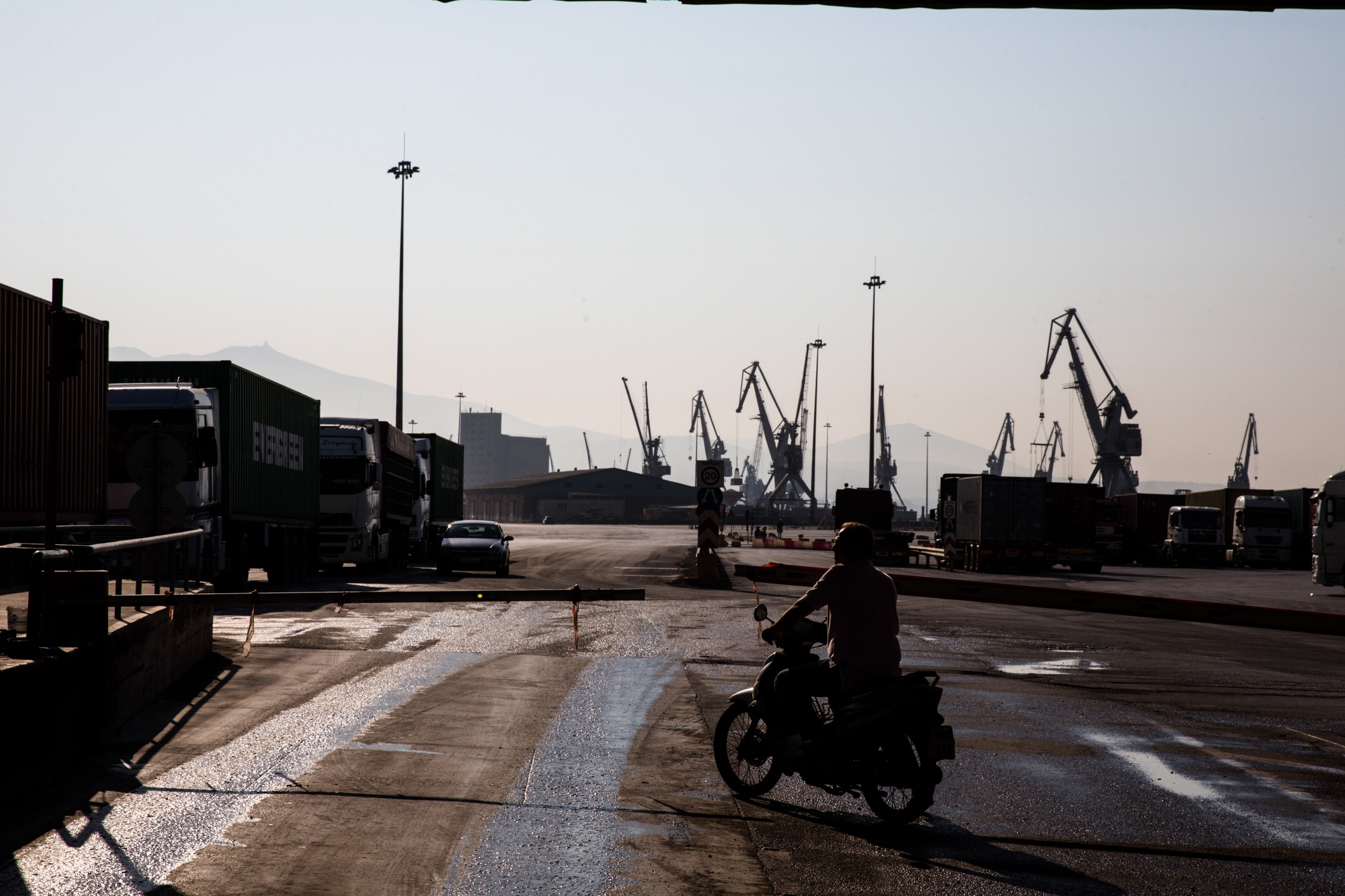Διαμαρτυρία οδηγών - μεταφορέων στο λιμάνι της Θεσσαλονίκης αποκλείοντας την Πύλη 16 του ΟΛΘ διαμαρτυρόμενοι για την έλλειψη απευθείας σύνδεσης του λιμανιού με την εθνική οδό, την κακή ποιότητα του οδοστρώματος και την έλλειψη σήμανσης στην είσοδο - έξοδο του λιμανιού, την υψηλή αξία των διοδίων, Θεσσαλονίκη, 30 Αυγούστου 2016.