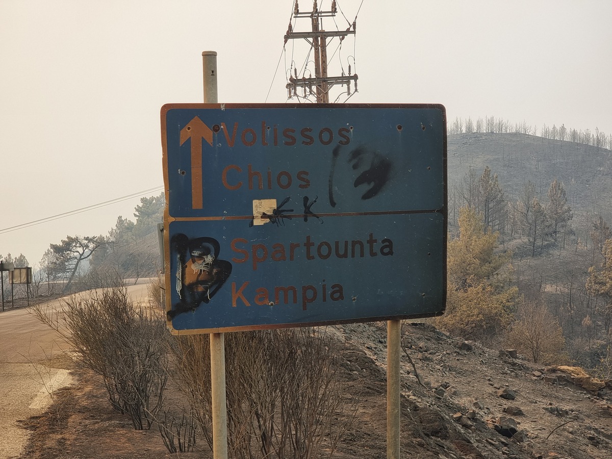 Καμμένη πινακίδα που γράφει "Βολισσός, Χίος, Σπαρτούντα, Καμπια", στην περιοχή της Νέας Ποταμιάς, στη Χίο, την Τετάρτη 13 Αυγούστου 2025. Σε εξέλιξη είναι η πυρκαγιά που συνεχίζει να καίει από χτες, Τρίτη 12 Αυγούστου, το μεσημέρι, δασική και χαμηλή βλάστηση στη βορειοδυτική Χίο.Το βάρος αυτή τη στιγμή, από τις πυροσβεστικές δυνάμεις, πέφτει στα δυο πύρινα μέτωπα. Το ένα κινείται μεταξύ των οικισμών Πιραμά και Παρπαριά και το άλλο που είναι και το πιο δύσκολο, πλησίον του οικισμού Περδικά με κατεύθυνση προς τους οικισμούς Σιδηρούντα, Διευχά και Χάλανδρα. Το βάρος των δυνάμεων πυρόσβεσης το μεσημέρι επικεντρώθηκε στην περιοχή Σπαρτούντα, ώστε να μη φτάσουν οι φλόγες στα Χάλανδρα. Λίγο μετά τις 2.00 το μεσημέρι εστάλη μήνυμα για εκκένωση της Σπαρτούντας, κατευθύνοντας τον κόσμο προς τα Καρδάμυλα.ΑΠΕ-ΜΠΕ/ΑΠΕ-ΜΠΕ/ΚΩΣΤΑΣ ΚΟΥΡΓΙΑΣ