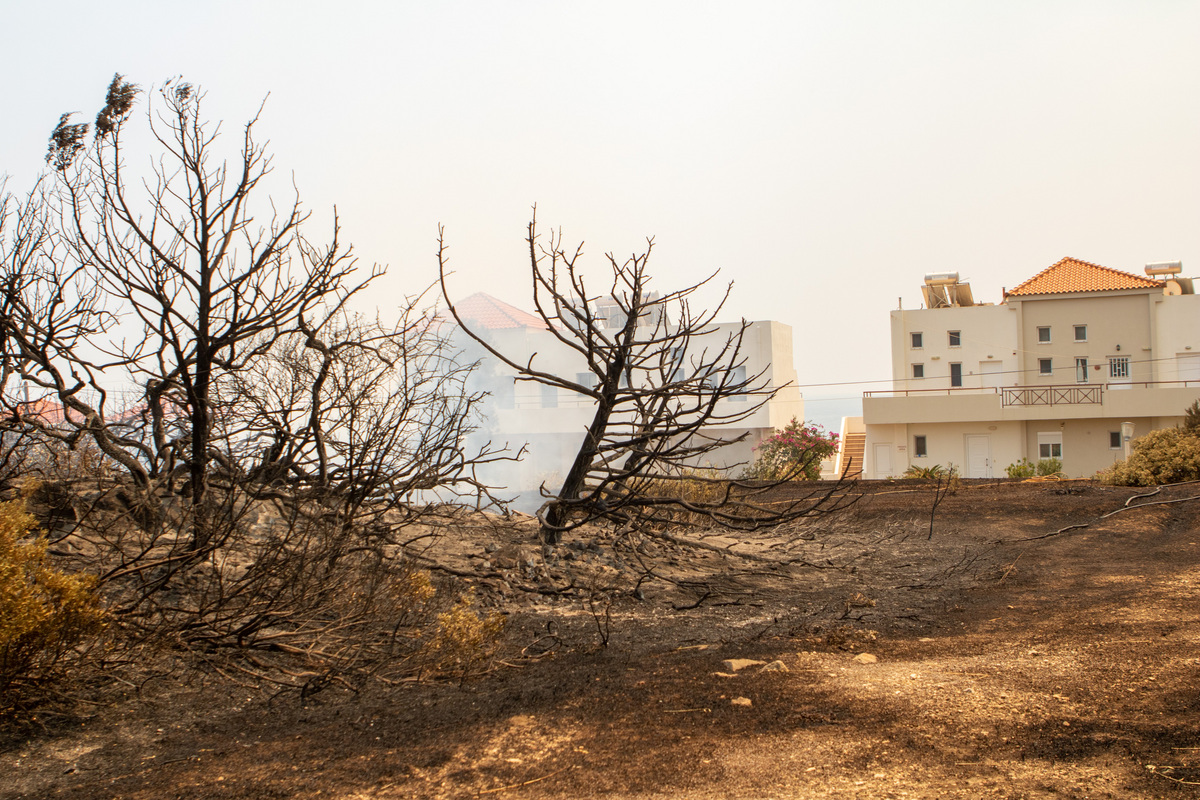 Καμένα δέντρα στην περιοχή Κιοτάρι νότια της Ρόδου , Κυριακή 23 Ιουλίου 2023. Ανεξέλεγκτη για έκτη ημέρα παραμένει η πυρκαγιά στο νησί της Ρόδου. Σε κατάσταση έκτακτης ανάγκης, λόγω της πυρκαγιάς που εξακολουθεί να μαίνεται στο νησί της Ρόδου, κηρύχθηκε με απόφαση του γενικού γραμματέα Πολιτικής Προστασίας η δημοτική ενότητα της Νότιας Ρόδου. Στο σημείο επιχειρούν 173 πυροσβέστες, 10 ομάδες πεζοπόρων τμημάτων, 35 οχήματα, 5 ελικόπτερα, 3 αεροσκάφη και 31 Σλοβάκοι με 5 οχήματα. ΑΠΕ-ΜΠΕ/ΑΠΕ-ΜΠΕ/ΛΕΥΤΕΡΗΣ ΔΑΜΙΑΝΙΔΗΣ