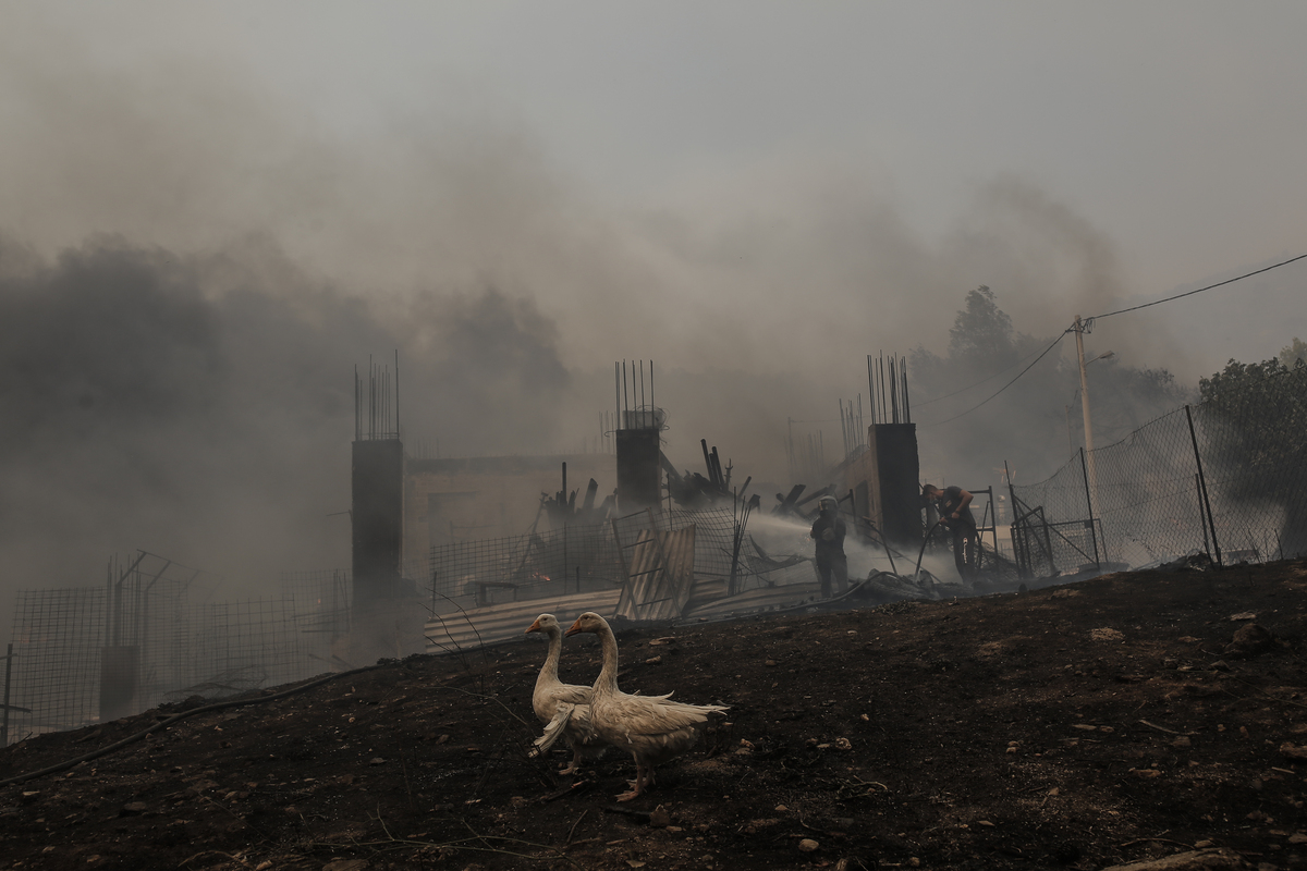 Δύο χήνες στέκονται σε καμένη έκταση από την πυρκαγιά στον οικισμό Καποτά στο Μενίδι, Τετάρτη 23 Αυγούστου 2023. Η πυρκαγιά που εκδηλώθηκε χθες στη Φυλή έχει επηρεάσει περιοχές νότια της Πάρνηθας στην ευρύτερη περιοχή της Ντάρδιζας αλλά και δυτικά, πλησίον των περιοχών Αγία Παρασκευή και Αμυγδαλέζα. Μήνυμα του 112 έχει σταλεί στους κατοίκους για εκκένωση των οικισμών Αγία Παρασκευή Μενιδίου και Καποτά όπου η φωτιά έχει πλησιάσει τα σπίτια. Επιχειρούν 202 πυροσβέστες με 9 ομάδες πεζοπόρων τμημάτων, 65 οχήματα και για την αεροπυρόσβεση έχουν διατεθεί 7 αεροσκάφη. ταυτόχρονα επιχειρούν ισχυρές δυνάμεις εθελοντών πυροσβεστών με πεζοπόρα τμήματα, δυνάμεις που έχει διαθέσει το Γενικό Επιτελείο Εθνικής Άμυνας, η Ελληνική Αστυνομία, καθώς και υδροφόρες και μηχανήματα έργου της Περιφέρειας Αττικής. ΑΠΕ-ΜΠΕ/ΑΠΕ-ΜΠΕ/ΚΩΣΤΑΣ ΤΣΙΡΩΝΗΣ