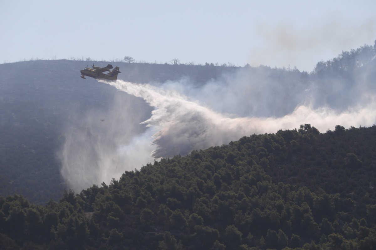 Πυροσβεστικό αεροσκάφος επιχειρεί στην κατάσβεση εστίας πυρκαγιάς στο Αφράτι Ευβοίας, την Πέμπτη 1 Αυγούστου 2024. Χωρίς μέτωπο είναι η πυρκαγιά που ξέσπασε χθες τις μεσημεριανές ώρες στον Πισσώνα Ευβοίας. Όπως έγινε γνωστό από την Πυροσβεστική, δεν υπάρχει μέτωπο πυρκαγιάς στην Εύβοια με τις πυροσβεστικές δυνάμεις να αντιμετωπίζουν διάσπαρτες εστίες εντός της περιμέτρου της φωτιάς. Όλο το βράδυ οι δυνάμεις της Πυροσβεστικής, της Πολιτικής Προστασίας, η Δασική Υπηρεσία και εθελοντές έδωσαν μάχη ώστε να περιορίσουν την φωτιά και δημιουργώντας με μηχανήματα έργου αντιπυρικές ζώνες κατέβαλλαν τεράστιες προσπάθειες ώστε να ανακόψουν την πορεία της. ΑΠΕ-ΜΠΕ/ΑΠΕ-ΜΠΕ/ΓΙΩΡΓΟΣ ΒΙΤΣΑΡΑΣ