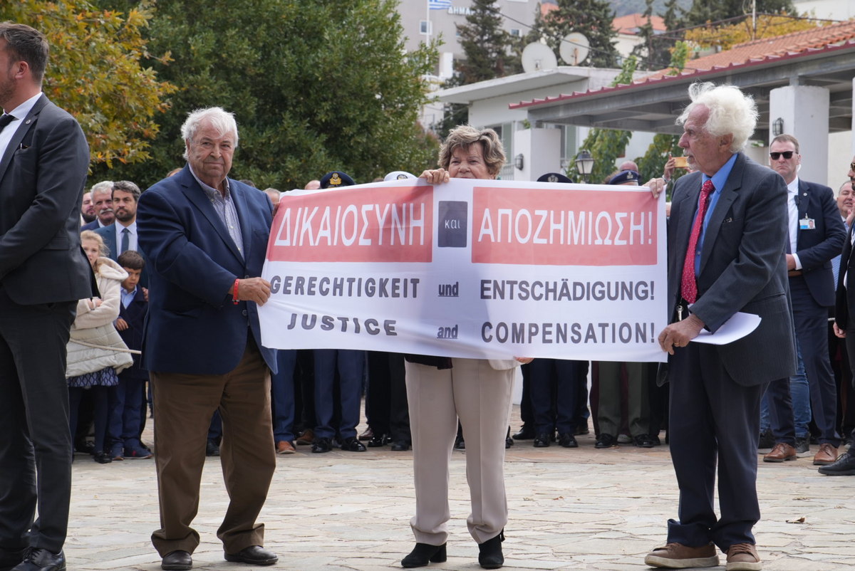 Συγγενείς Απόγονων Θυμάτων του Ολοκαυτώματος κρατάνε πανό κατά την διάρκεια της επίσκεψής του Προέδρου της Γερμανίας Φρανκ-Βάλτερ Σταϊνμάιερ στο χωριό Κάντανο Χανίων, Πέμπτη 31 Οκτωβρίου 2024. ΑΠΕ-ΜΠΕ / ΠΕΤΡΟΣ ΠΑΤΤΑΚΟΣ