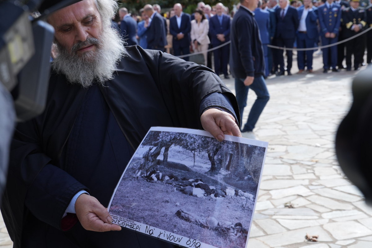 Ο παπά Δημήτρης κρατάει φωτογραφία με του εκτελεσθέντες από τους Γερμανούς στο Κοντομαρί, πριν την άφιξη του Προέδρου της Γερμανίας Φρανκ-Βάλτερ Σταϊνμάιερ στην Κάντανο Χανίων, Πέμπτη 31 Οκτωβρίου 2024. ΑΠΕ-ΜΠΕ / ΠΕΤΡΟΣ ΠΑΤΤΑΚΟΣ
