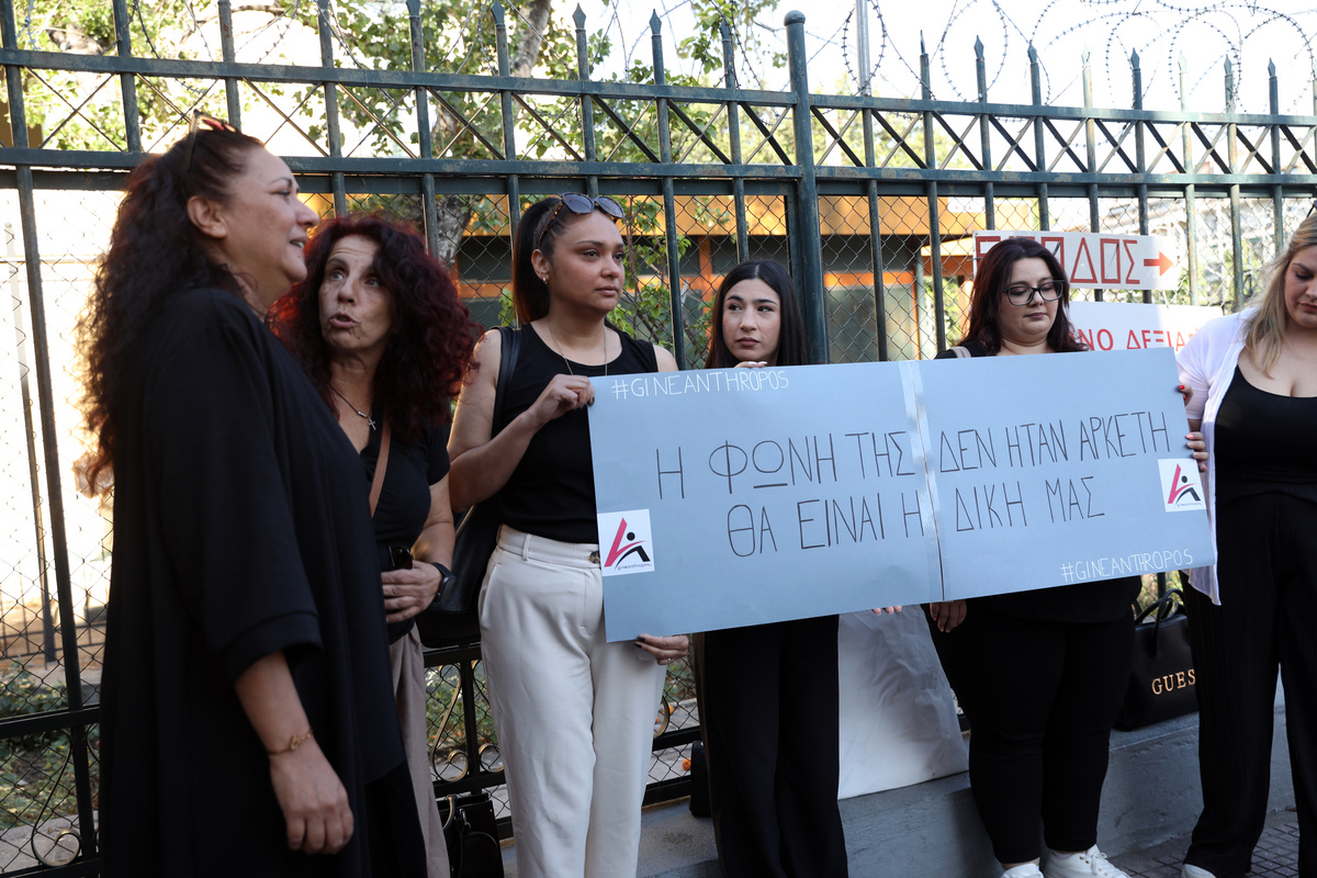 Η μητέρα της Κυριακής Γρίβα, Δέσποινα Καλλέα (Α) στέκεται δίπλα σε μία ομάδα γυναικών που κρατούν πανό διαμαρτυρίας, έξω από το Μικτό Ορκωτό Δικαστήριο στα δικαστήρια της πρώην Σχολής Ευελπίδων, την Τετάρτη 4 Ιουνίου 2025, λίγο πριν την έναρξη της δίκης του 39χρονου κατηγορούμενου για τη στυγερή δολοφονία της 28χρονης Κυριακής Γρίβα έξω από το Α.Τ. Αγίων Αναργύρων τον Απρίλιο του 2024. ΑΠΕ-ΜΠΕ/ΑΠΕ-ΜΠΕ/ΓΙΩΡΓΟΣ ΒΙΤΣΑΡΑΣ