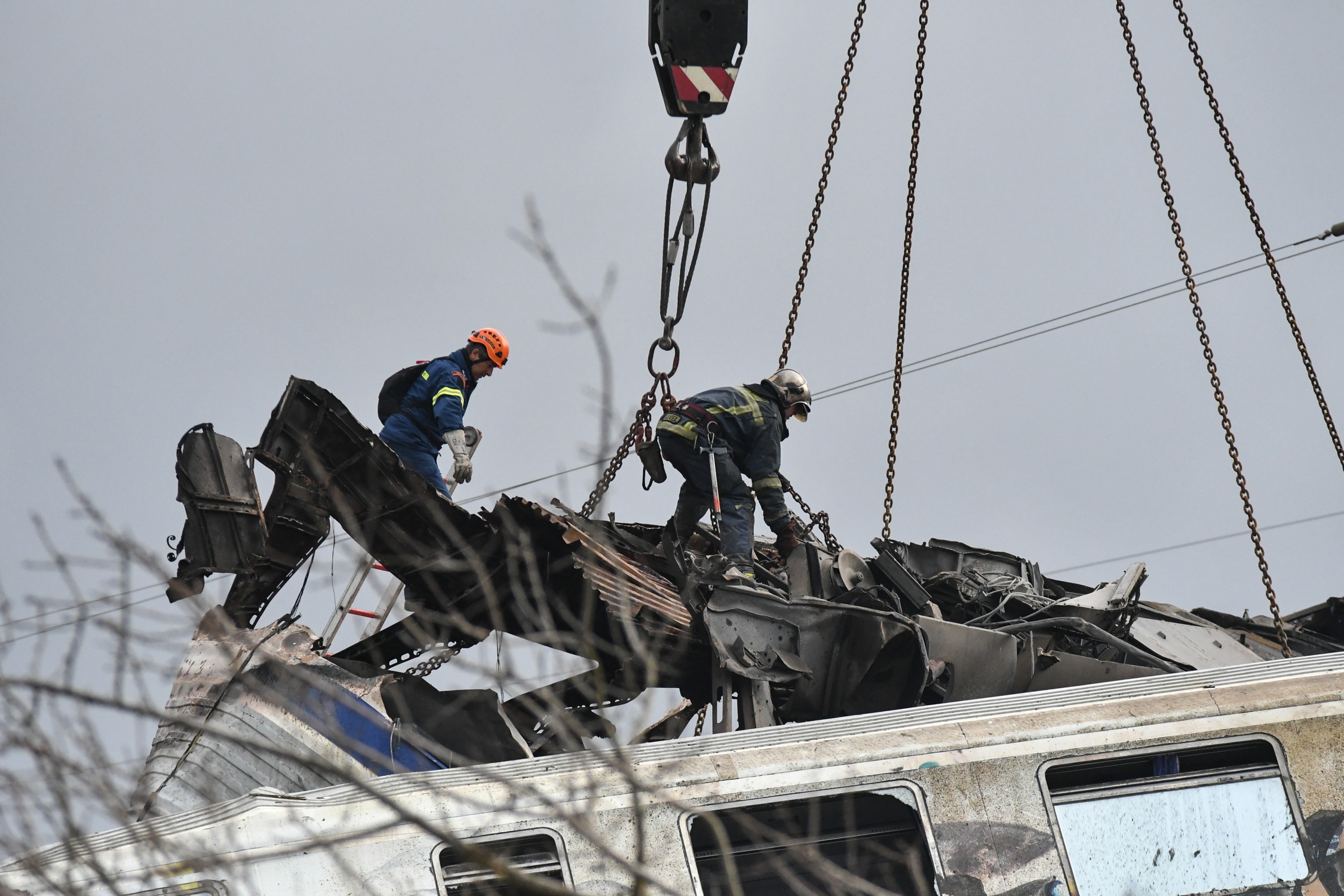 Firefighters and rescue crews search through the wreck of a train, in the Evangelismos area of Larissa, Tempi, Greece on March 1, 2023. A rail accident involving a cargo and a passenger train colliding, occured at around 23:30 on February 28, 2023, with more than 32 dead and 85 injured. / Πυροσβέστες και διασώστες ερευνούν στα συντρίμμια των αμαξοστοιχιών έπειτα απο το σιδηροδρομικό δυστύχημα με σύγκρουση μιας εμπορικής και μιας επιβατικής αμαξοστοιχίας στην περιοχή Ευαγγελισμός Λάρισας, Τέμπη, 1 Μαρτίου 2023.