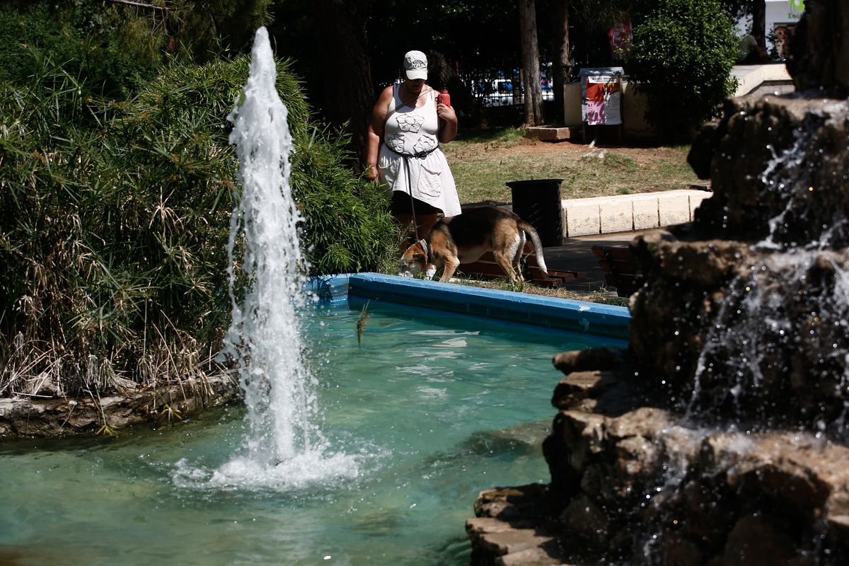 Μία γυναίκα περνάει πίσω από ένα συντριβάνι κατά τη διάρκεια καύσωνα στην Αθήνα, Τετάρτη 12 Ιουλίου 2023. Επίπεδο επικινδυνότητας 3 με ακραίες θερμοκρασίες, που έχουν σημαντικές επιπτώσεις στην υγεία, προβλέπει η μονάδα ΜΕΤΕΟ του Εθνικού Αστεροσκοπείου Αθηνών αύριο, Πέμπτη 13 Ιουλίου, για την Αθήνα και την Παρασκευή 14 Ιουλίου για την Αθήνα, τη Θεσσαλονίκη και τη Λάρισα. ΑΠΕ-ΜΠΕ/ΑΠΕ-ΜΠΕ/ΓΙΑΝΝΗΣ ΚΟΛΕΣΙΔΗΣ