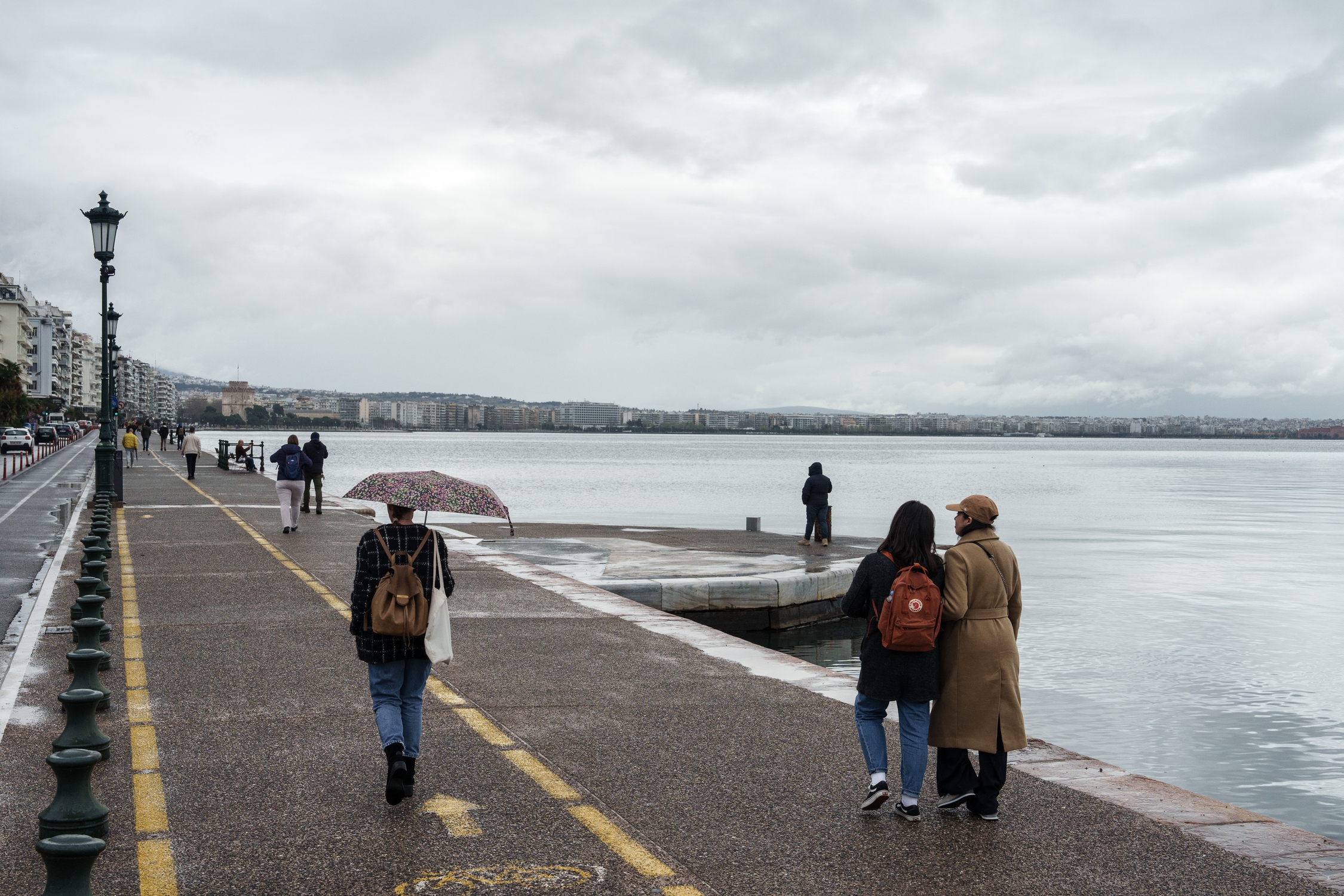 People walk after rain on the old seafront promenade of Thessaloniki, Greece on March 5, 2024. / Κόσμος περπατάει έπειτα από βροχόπτωση στην παλιά παραλία της Θεσσαλονίκης, 5 Μαρτίου 2024.