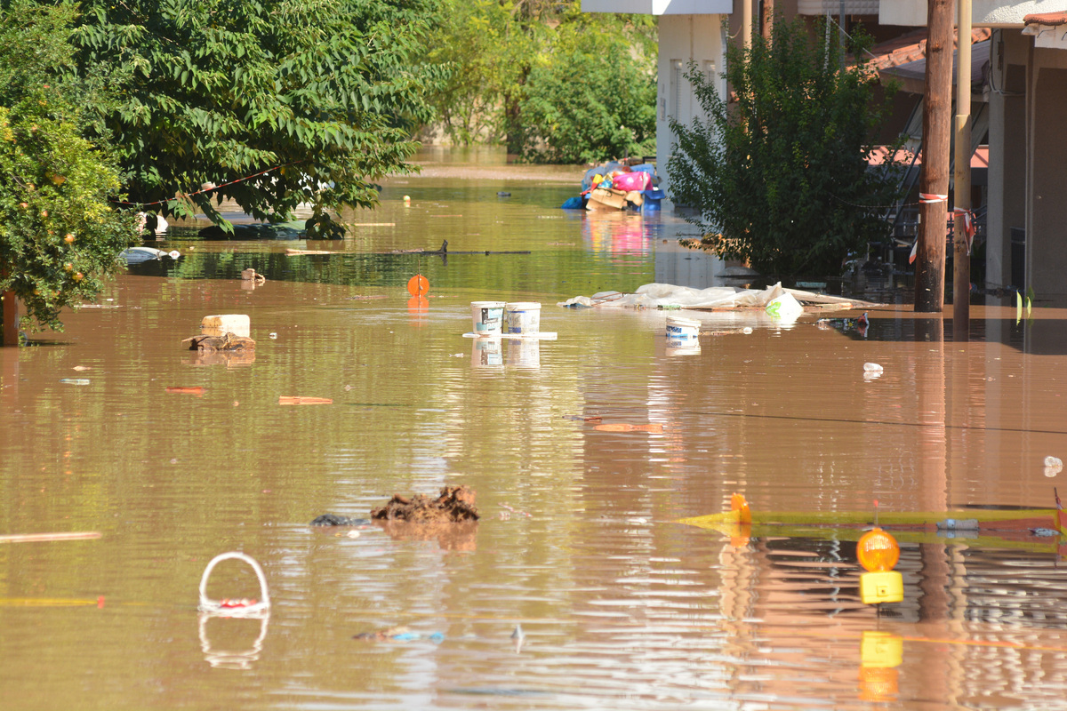 Πλημμυρισμένος δρόμος σε παραποτάμια συνοικία, στη Λάρισα, την Παρασκευής 8 Σεπτεμβρίου 2023.