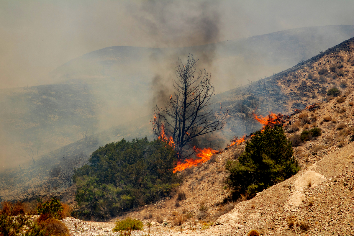 Φωτιά καίει θάμνους και δέντρα στην περιοχή Βάτι, στη Ρόδο, Τρίτη 25 Ιουλίου 2023. Σε Ρόδο και Κέρκυρα εξελίσσονται τα σοβαρότερα μέτωπα πυρκαγιών, ενώ στα υπόλοιπα μέτωπα αντιμετωπίζονται μέχρι στιγμής πολλές αναζωπυρώσεις, όπως ανέφερε σε έκτακτη ενημέρωση ο εκπρόσωπος Τύπου του Πυροσβεστικού Σώματος, αντιπύραρχος Γιάννης Αρτοποιός. Όπως επισήμανε, στη Ρόδο η αναζωπύρωση που εκδηλώθηκε από τις πρωινές ώρες στην περιοχή Βάτι έλαβε διαστάσεις και για αυτό το λόγο εκδόθηκε μήνυμα από το 112 για απομάκρυνση των κατοίκων προς Λίνδο και προσέθεσε ότι «επιχειρούν αδιάκοπα 266 πυροσβέστες 16 ομάδες πεζοπόρων τμημάτων, 55 υδροφόρα οχήματα, πλήθος εθελοντών, καθώς και όλοι οι φορείς της Πολιτικής Προστασίας, ενώ έχουν διατεθεί και δυνάμεις από το πρώτο φως της ημέρας, 9 αεροσκάφη και 4 ελικόπτερα». ΑΠΕ-ΜΠΕ/ΑΠΕ-ΜΠΕ/ ΛΕΥΤΕΡΗΣ ΔΑΜΙΑΝΙΔΗΣ