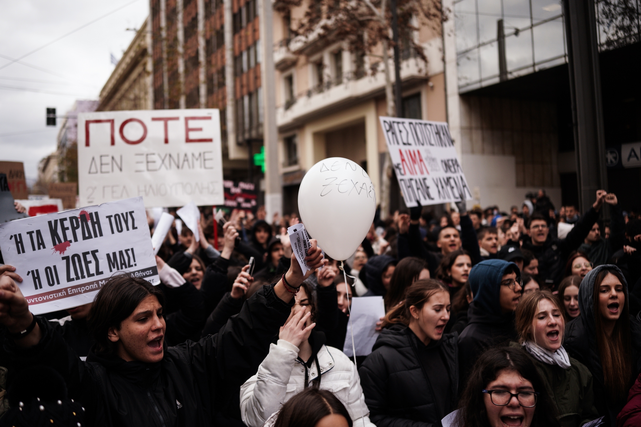 Students take part in a demonstration to demand justice for the 2023 Tempe fatal train accident, in Athens , Greece on February 7, 2025. / Μαθητές και φοιτητές διαδηλώνουν απαιτόντας δικαιοσύνη για το θανατηφόρο σιδηροδρομικό δυστύχημα των Τεμπών το 2023, στην Αθήνα , στις 7 Φεβρουαρίου 2025.