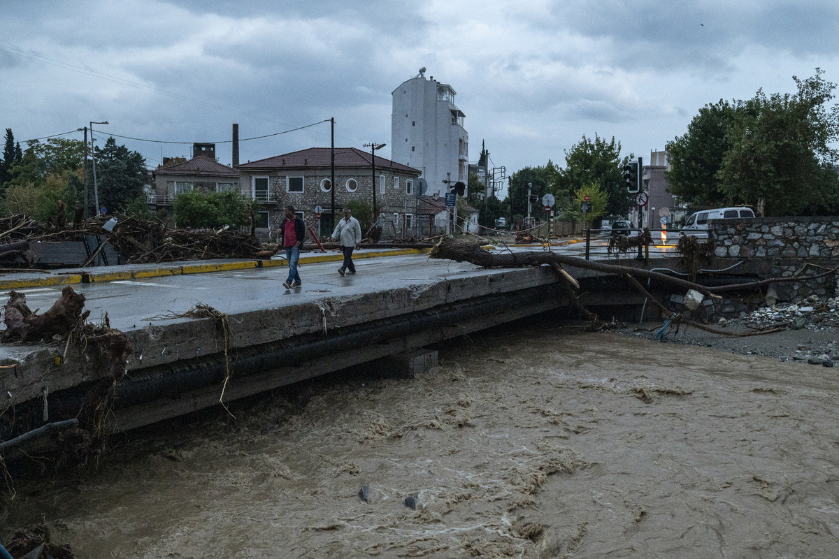 Κάτοικος διασχίζει πλημμυρισμένο δρόμο μετά το πέρασμα της κακοκαιρίας Elias στην περιοχή Νεάπολη Βόλου, Πέμπτη 28 Σεπτεμβρίου 2023. ΑΠΕ-ΜΠΕ/ΧΑΤΖΗΠΟΛΙΤΗΣ ΝΙΚΟΛΑΟΣ