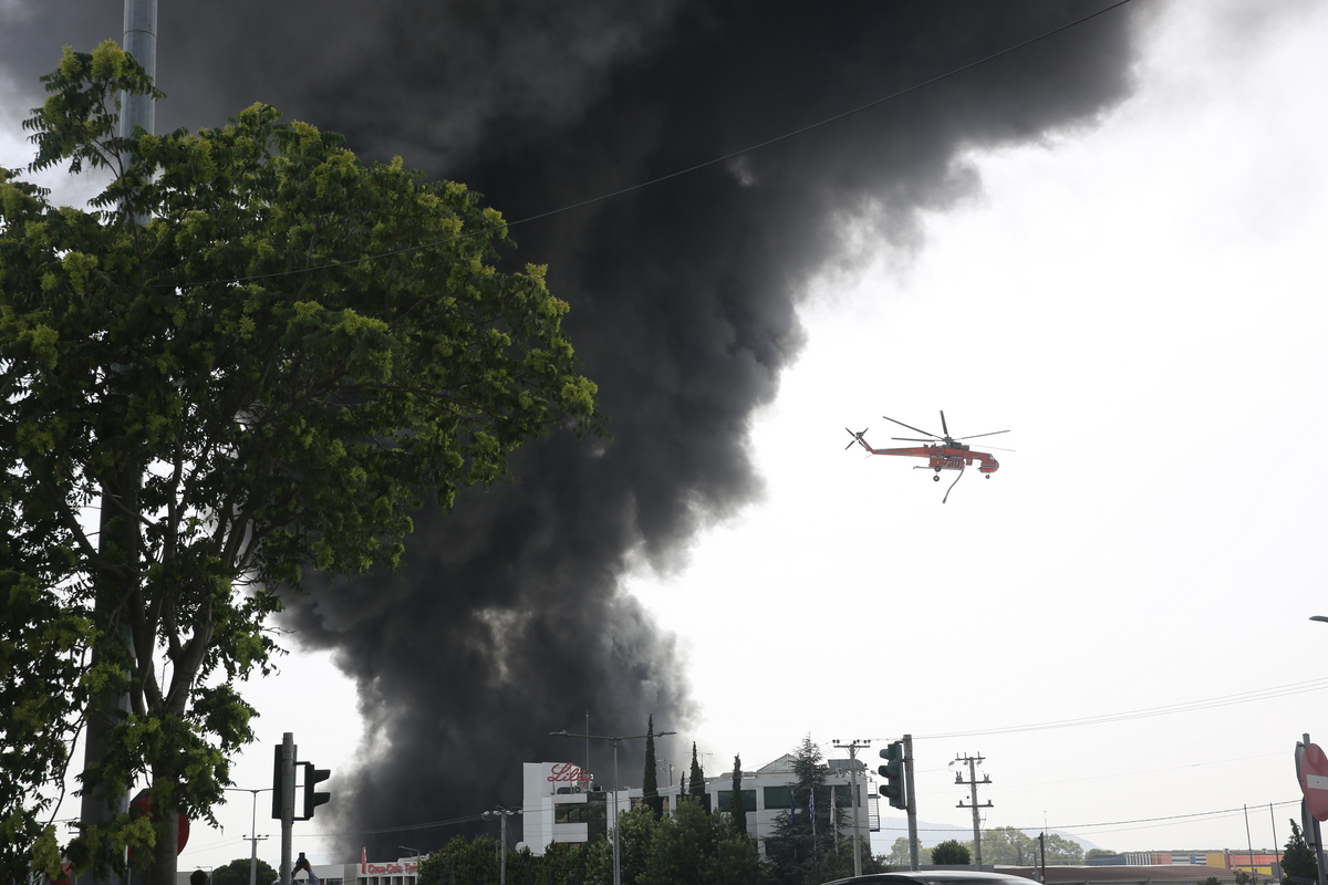 Πυροσβεστικό ελικόπτερο επιχειρεί στην κατάσβεση της πυρκαγιάς σε εργοστάσιο στην οδό Αιγιδών στην Κάτω Κηφισιά την Τετάρτη 12 Ιουνίου 2024. Έκρηξη και φωτιά σημειώθηκε το μεσημέρι σε εργοστάσιο στην Κάτω Κηφισιά και συγκεκριμένα επί της οδού Αιγιδών. Προειδοποιητικό μήνυμα 112 ήχησε για την προστασία των πολιτών από τους πυκνούς καπνούς. «Οι καπνοί κατευθύνονται στην περιοχή σας. Παραμείνετε σε εσωτερικούς χώρους, κλείστε πόρτες και παράθυρα. Ακολουθείτε τις οδηγίες των Αρχών». Λόγω της φωτιάς, διεκόπη η κυκλφορία στην Κηφισίας, στον παράδρομο της Εθνικής Οδού Αθηνών – Λαμίας από το ύψος του κόμβου Καλυφτάκη στο ρεύμα προς Αθήνα. ΑΠΕ- ΜΠΕ/ΑΠΕ- ΜΠΕ/ΑΛΕΞΑΝΔΡΟΣ ΒΛΑΧΟΣ