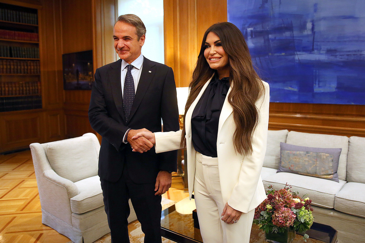 Ο πρωθυπουργός Κυριάκος Μητσοτάκης υποδέχεται την πρέσβη των ΗΠΑ στην Ελλάδα Kimberly Guilfoyle, στη συνάντησή τους στο Μέγαρο Μαξίμου, Αθήνα Τετάρτη 5 Νοεμβρίου 2025. ΑΠΕ-ΜΠΕ/ΑΠΕ-ΜΠΕ/ΟΡΕΣΤΗΣ ΠΑΝΑΓΙΩΤΟΥ