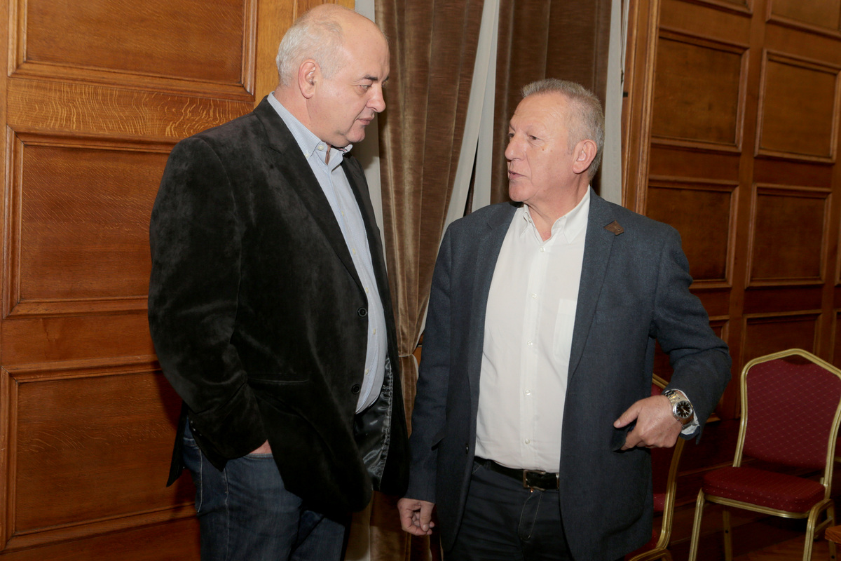 Οι Θανάσης Παφίλης (Α) και ο Νίκος Καραθανασόπουλος (Δ) συνομιλούν σε εκδήλωση της Κοινοβουλευτικής Ομάδας του ΚΚΕ τις προτάσεις του Κόμματος για τη Συνταγματική Αναθεώρηση , Πέμπτη 6 Δεκεμβρίου 2018. ΑΠΕ-ΜΠΕ/ΑΠΕ-ΜΠΕ/Παντελής Σαίτας