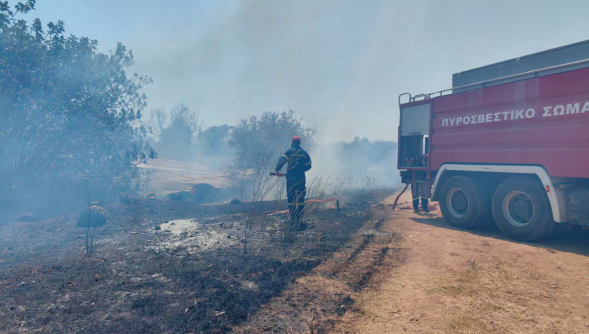 Πυρκαγιά εκδηλώθηκε κοντά σε απαλλοτριωμένο αρχαιολογικό χώρο στη Νέα Εθνική Οδό Ναυπλίου – Μυκηνών στην Αργολίδα, Σάββατο 26 Ιουλίου 2025. Ισχυρές δυνάμεις της πυροσβεστικής έσπευσαν στο σημείο για την κατάσβεση της πυρκαγιάς που έκαψε, ξερά χόρτα, πορτοκαλιές, ελιές και ένα παλιό παράπηγμα που καταστράφηκε μέσα στον απαλλοτριωμένο αρχαιολογικό χώρο. Έρευνα για τα αίτια και τις συνθήκες της πυρκαγιάς διενεργεί η Πυροσβεστική Υπηρεσία Άργους. ΑΠΕ-ΜΠΕ/ΑΠΕ-ΜΠΕ/ΜΠΟΥΓΙΩΤΗΣ ΕΥΑΓΓΕΛΟΣ