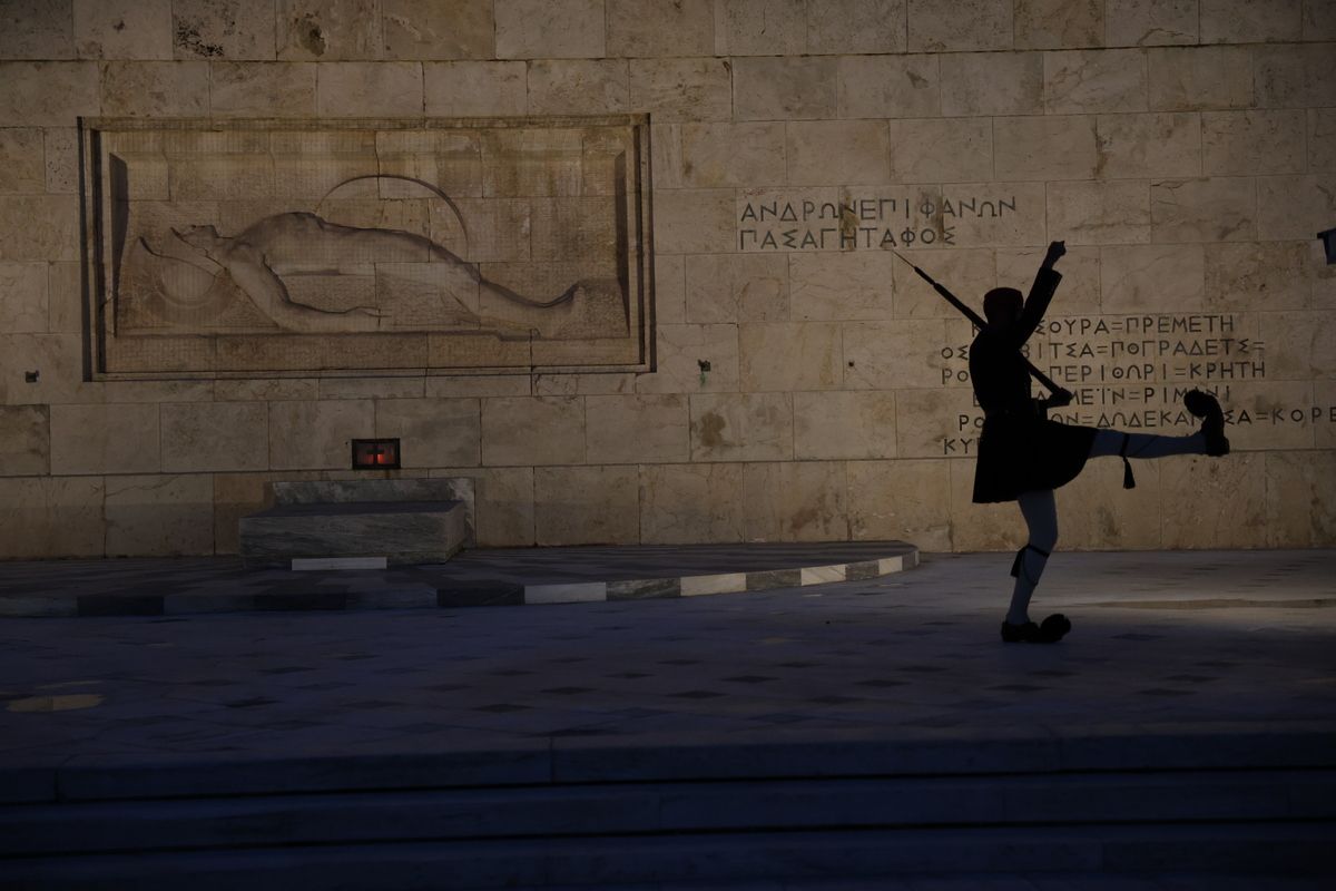 Εύζωνες μπροστά από το μνημείο του Αγνώστου Στρατιώτη στο Σύνταγμα, Τρίτη 21 Οκτωβρίου 2025. Κόσμος συμμετέχει σε συγκέντρωση διαμαρτυρίας στο Σύνταγμα, κατά της ψήφισης της τροπολογίας από την Ολομέλεια της Βουλής, για το Μνημείο του Αγνώστου Στρατιώτη. Η τροπολογία προβλέπει ποινή φυλάκισης ή πρόστιμο σε όσους παραβιάσουν τους νέους κανόνες, ενώ παράλληλα ορίζει τις αρμοδιότητες των υπουργείων Άμυνας και Προστασίας του Πολίτη για το Μνημείο. ΑΠΕ-ΜΠΕ/ΑΠΕ-ΜΠΕ/ΓΙΩΡΓΟΣ ΒΙΤΣΑΡΑΣ