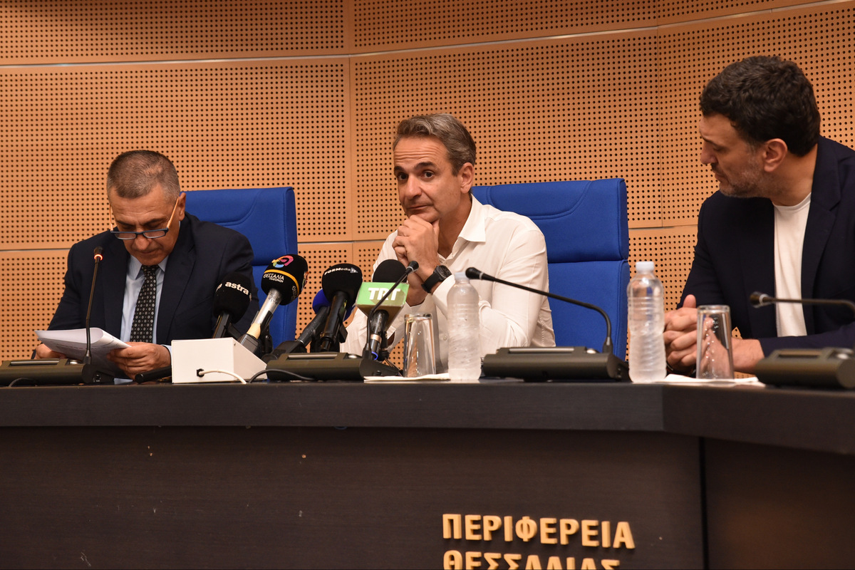 Ο πρωθυπουργός Κυριάκος Μητσοτάκης (Κ), ο υπουργός Κλιματικής Κρίσης και Πολιτικής Προστασίας Βασίλης Κικίλιας (Δ) και ο περιφερειάρχης Θεσσαλίας Δημήτρης Κουρέτας (Α), συμμετέχουν στη σύσκεψη, στη Λάρισα την Τρίτη 4 Ιουνίου 2024. Τη Λάρισα επισκέπτεται σήμερα ο πρωθυπουργός Κυριάκος Μητσοτάκης. όπου παρέστη στα εγκαίνια του Επιχειρησιακού Κέντρου Πολιτικής Προστασίας Θεσσαλίας και στη συνέχεια προέδρευσε σε σύσκεψη με αντικείμενο τα μέτρα αποκατάστασης από τις καταστροφές που προκάλεσαν οι κακοκαιρίες «Daniel» και «Elias». ΑΠΕ-ΜΠΕ/ΑΠΕ-ΜΠΕ/ΑΠΟΣΤΟΛΗΣ ΝΤΟΜΑΛΗΣ