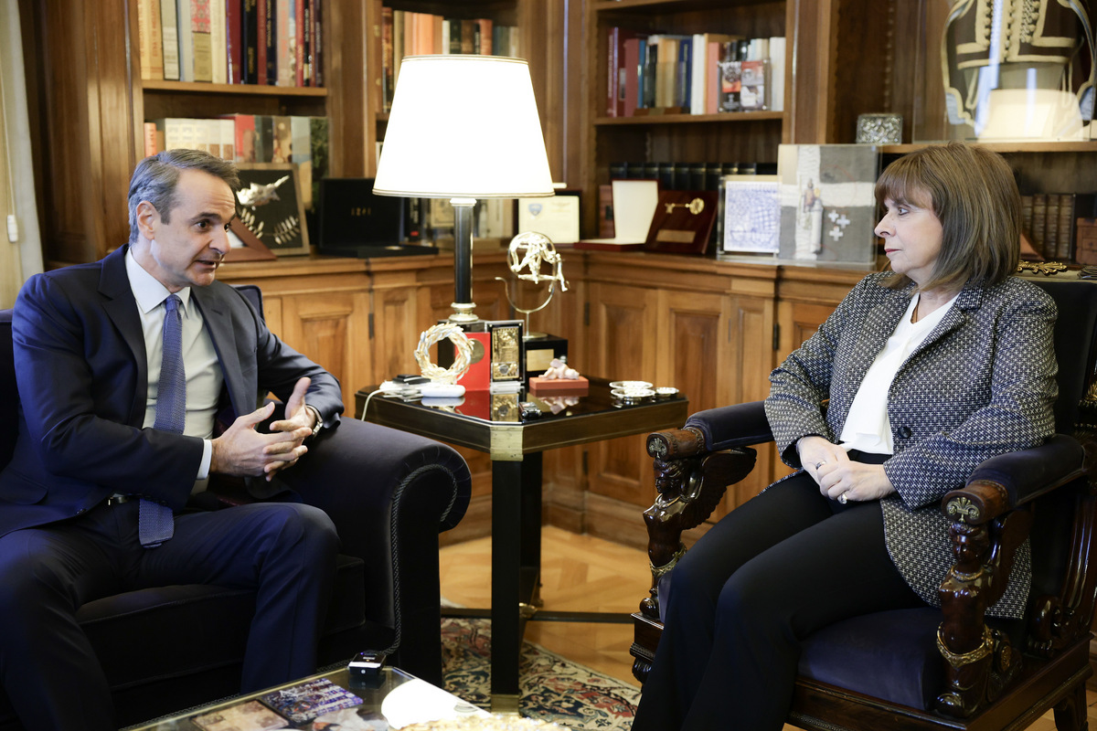 (ΞΕΝΗ ΔΗΜΟΣΙΕΥΣΗ) Η Πρόεδρος της Δημοκρατίας Κατερίνα Σακελλαροπούλου συνομιλεί με τον πρωθυπουργό Κυριάκο Μητσοτάκη, κατά τη συνάντησή τους στο Προεδρικό Μέγαρο, Αθήνα, τη Δευτέρα 29 Ιανουαρίου 2024. ΑΠΕ-ΜΠΕ/ΠΡΟΕΔΡΙΑ ΤΗΣ ΔΗΜΟΚΡΑΤΙΑΣ/ΘΟΔΩΡΗΣ ΜΑΝΩΛΟΠΟΥΛΟΣ