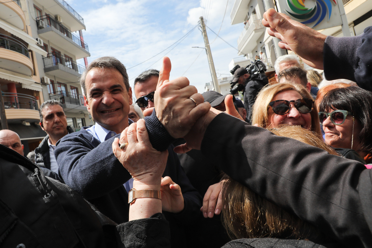 Ο πρωθυπουργός Κυριάκος Μητσοτάκης χαιρετά πολίτες κατά τη διάρκεια της επίσκεψής του στην Πετρούπολη, την Πέμπτη 6 Απριλίου 2023. ΑΠΕ-ΜΠΕ/ΑΠΕ-ΜΠΕ/ΓΙΩΡΓΟΣ ΒΙΤΣΑΡΑΣ
