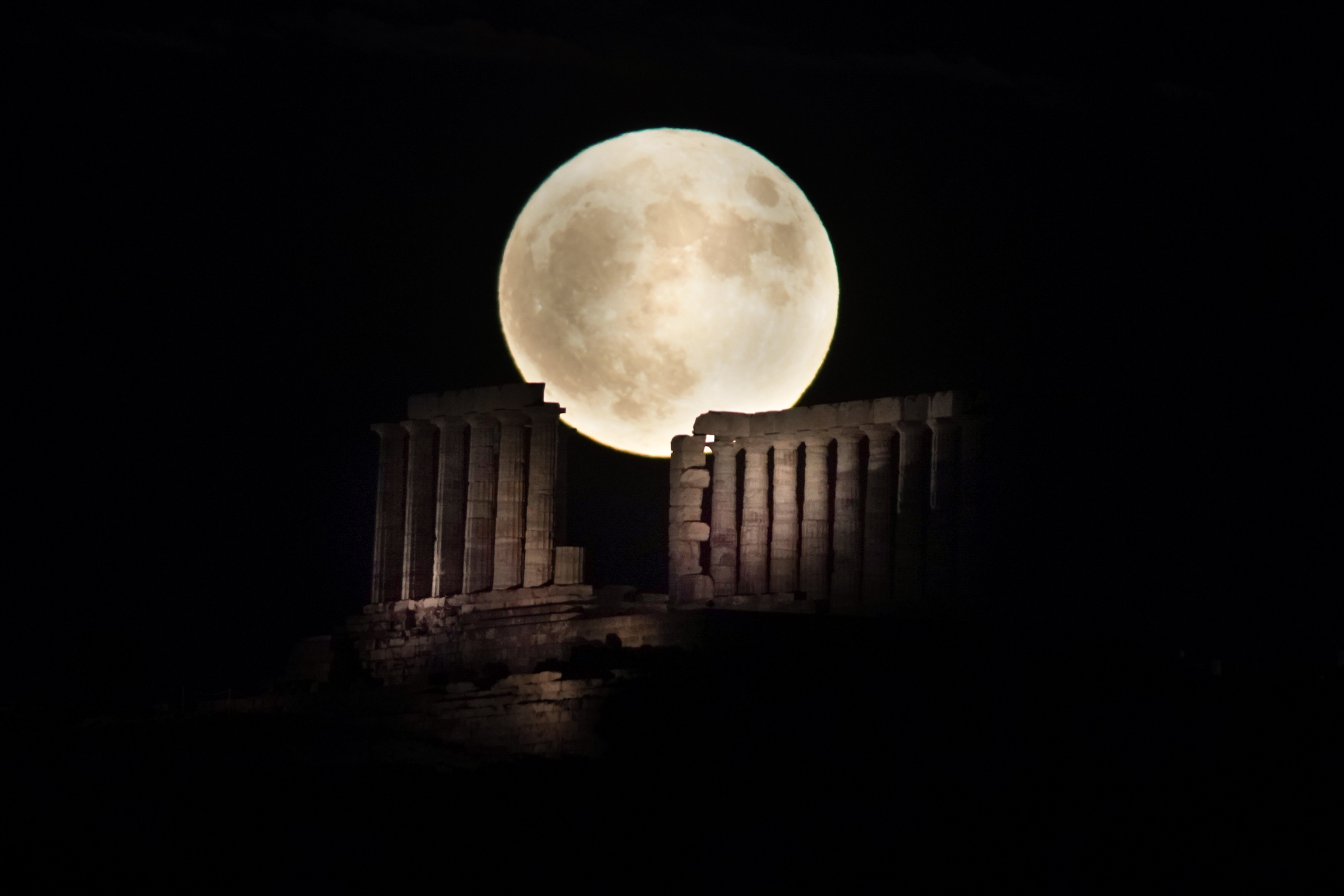 Buck Super Full Moon of July, rises by the ancient temple of Poseidon at cape Sounio, some 65 km southeast of Athens, on July 13 , 2022. / Η Υπέρπανσέληνος του Ελαφίου υψώνεται πάνω από τον αρχαίο ναό του Ποσειδώνα στο ακρωτήριο στο Σούνιο, στις 13 Ιουλίου, 2022