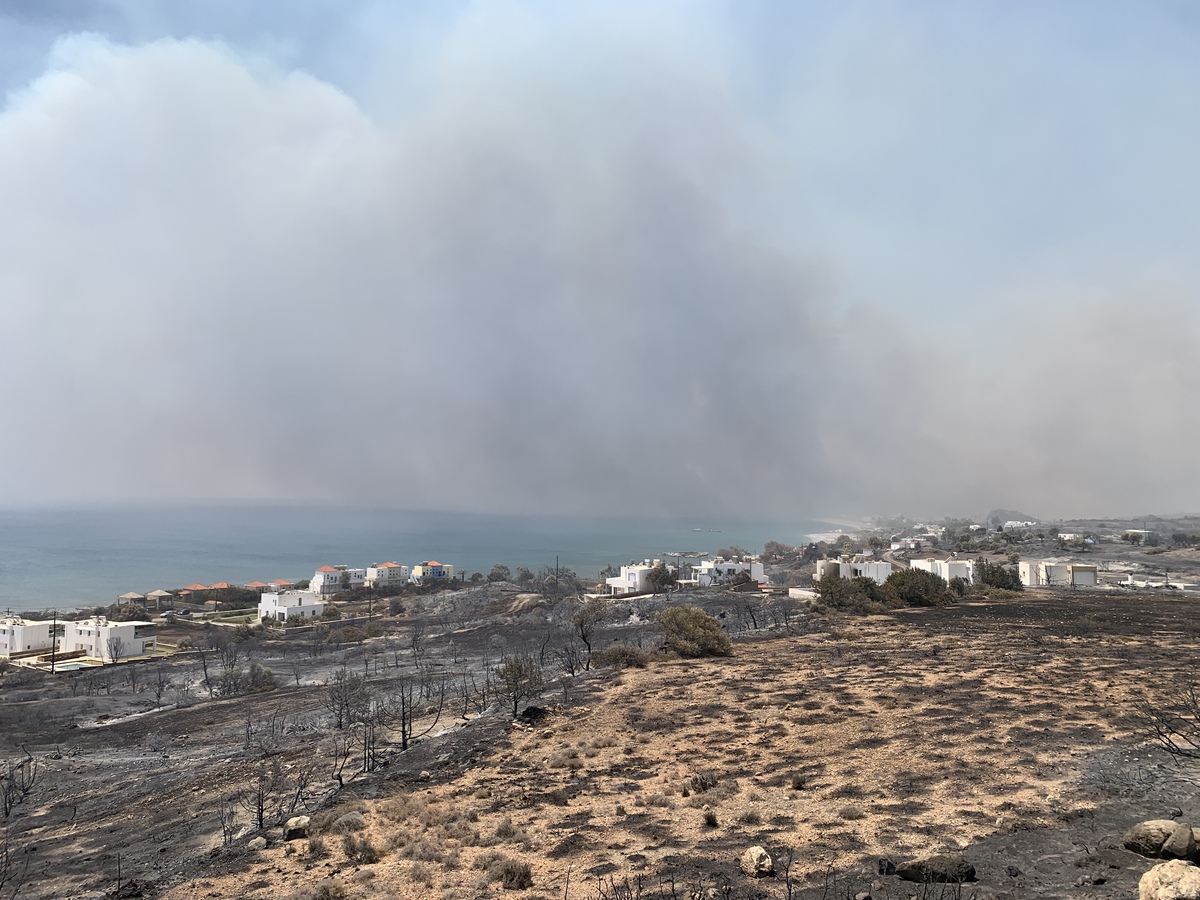Καμένη έκταση από την πυρκαγιά στην περιοχή Κιοτάρι της Ρόδου, Δευτέρα 24 Ιουλίου 2023. Μάχη για να μη μπεί η φωτιά στα χωριά Γεννάδι και Βάτι δίνουν οι πυροσβεστικές δυνάμεις και οι εθελοντές, στη νότια Ρόδο. Στην περιοχή έχουν σπεύσει αρκετά πυροσβεστικά οχήματα και εθελοντές ενώ γίνονται και ρίψεις νερού από πυροσβεστικά αεροπλάνα. Πριν από λίγο με εντολή από το 112 αποφασίστηκε η εκκένωση και των δύο χωριών. Μάχη συνεχίζει να δίνεται και στο Ασκληπειό όπου έχουν καεί σπίτια. ΑΠΕ-ΜΠΕ/ΑΠΕ-ΜΠΕ/ΛΕΥΤΕΡΗΣ ΔΑΜΙΑΝΙΔΗΣ