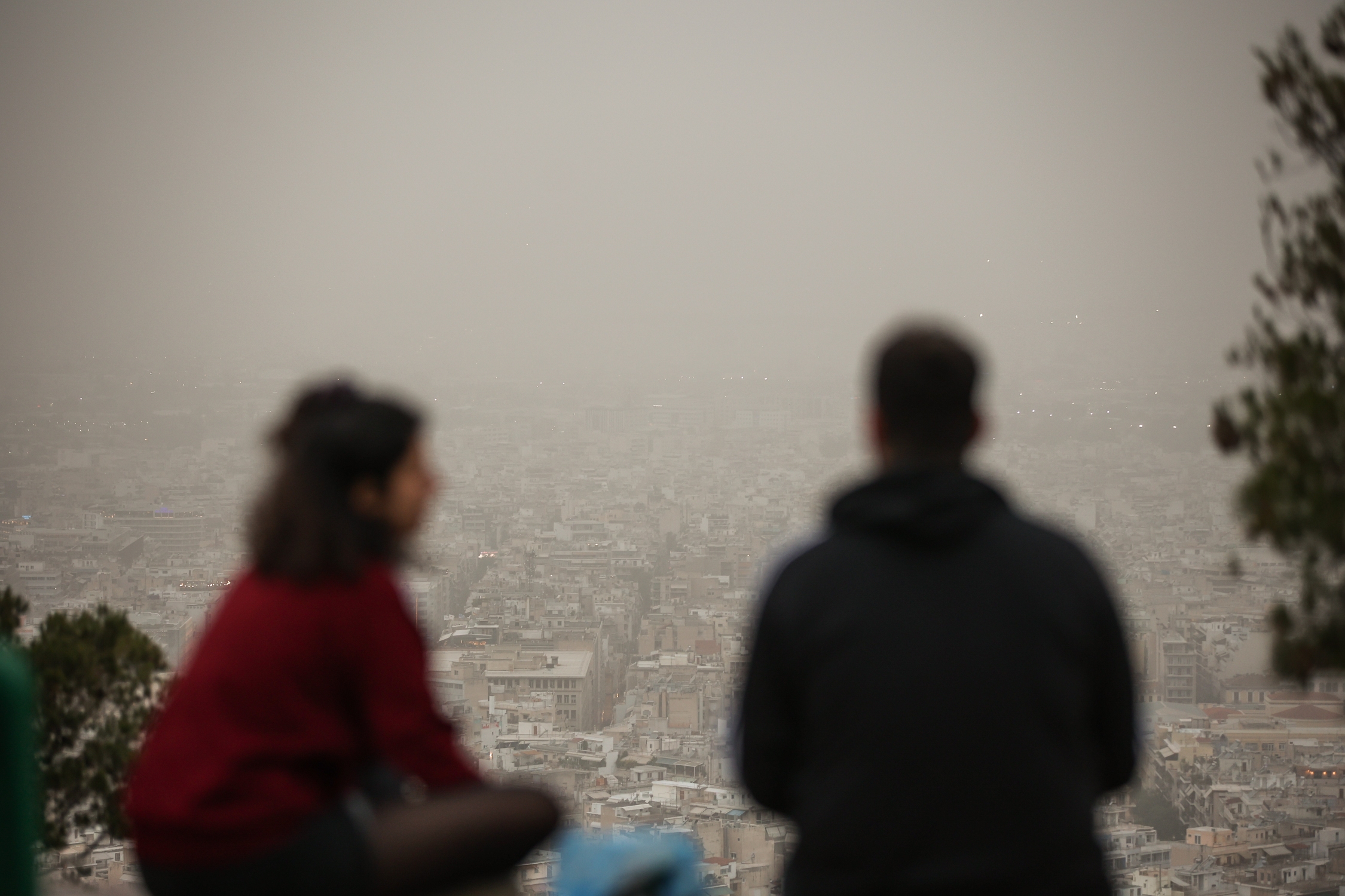 Haze covers the city of Athens, caused by dust clouds moved from the Sahara Desert in Africa due to south winds, on May 16, 2025 / Σκόνη που έχει μεταφερθεί απο την Έρημο Σαχάρα της Αφρικής, καλύπτει την ατμόσφαιρα της Αττικής, στην Αθήνα, στις 16 Μαίου, 2025