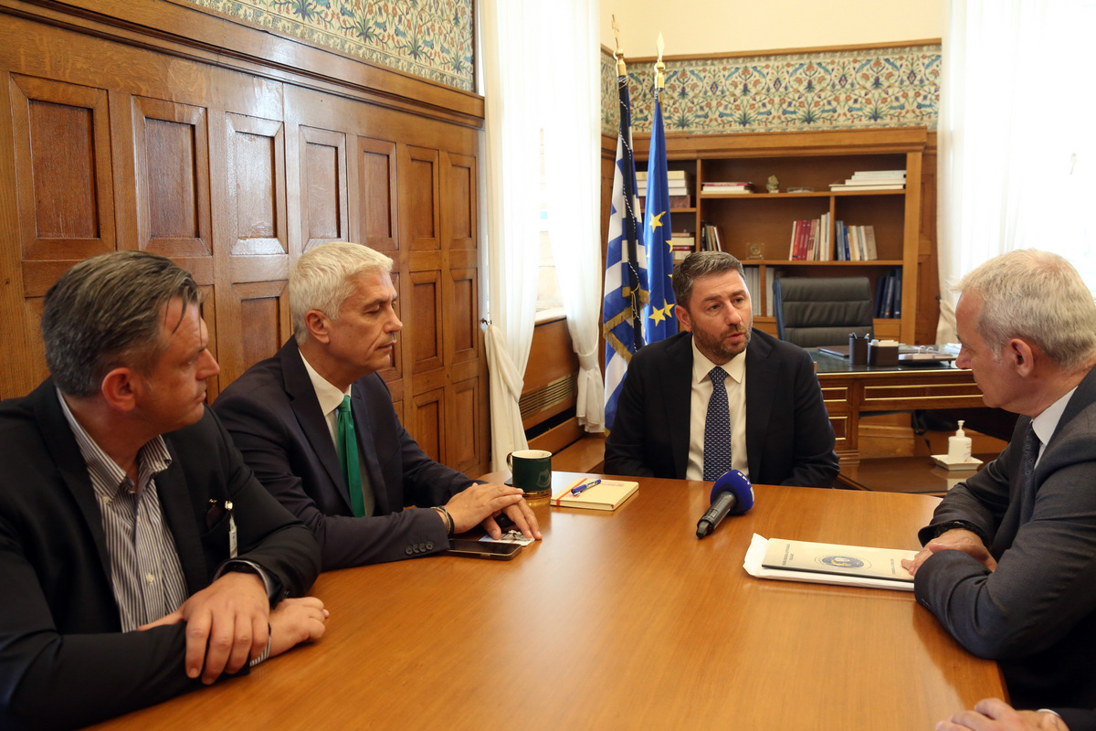 Ο πρόεδρος του ΠΑΣΟΚ - ΚΙΝΑΛ Νίκος Ανδρουλάκης (2Δ) συνομιλεί με τον πρόεδρο της ΠΟΑΣΥ Γρηγόρη Γερακαράκο (Δ) και εκπροσώπους του ΔΣ της Ένωσης, κατά τη διάρκεια της συνάντησής τους στο γραφείο του στη Βουλή, Δευτέρα 22 Απριλίου 2024. ΑΠΕ-ΜΠΕ/ΑΠΕ-ΜΠΕ/Αλέξανδρος Μπελτές