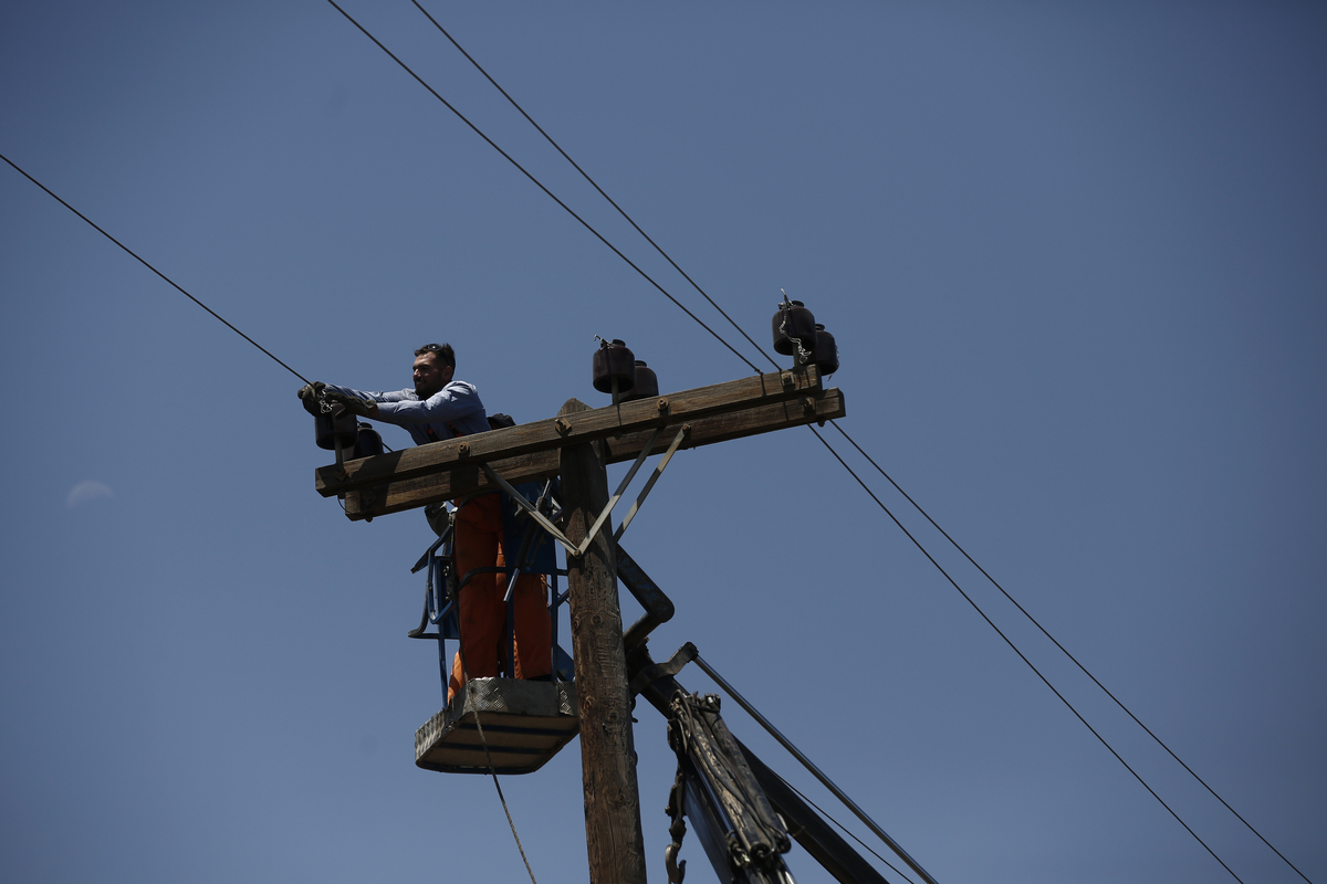 Άνδρες του ΔΕΔΔΗΕ σκαρφαλωμένοι σε στύλο αποκαθιστούν τις ζημιές στο δίκτυο ηλεκτροδότησης, τη δεύτερη μέρα μετά την καταστροφική πυρκαγιά που εκδηλώθηκε στο Νταού Πεντέλης και πήρε γρήγορα ανεξέλεγκτες διαστάσεις, Ντράφι, Πέμπτη 21 Ιουλίου 2022. ΑΠΕ-ΜΠΕ/ΑΠΕ-ΜΠΕ/ΓΙΑΝΝΗΣ ΚΟΛΕΣΙΔΗΣ