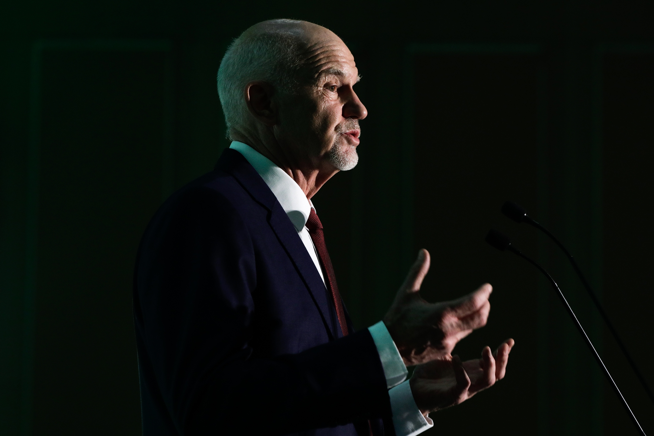 Former Prime Minister and president of PASOK, Giorgos Papandreou, delivers a pre-election speech to his supporters during a pre-election rally for the leadership of KINAL in Thessaloniki, Greece on December 3, 2021. / Προεκλογική ομιλία του πρωην πρωθυπουργού και προεδρου του ΠΑΣΟΚ, Γιώργου Παπανδρέου, υποψήφιου για την ηγεσία του Κινήματος Αλλαγής; (ΚΙΝΑΛ) στην Θεσσαλονίκη στις 3 Δεκεμβρίου,2021.