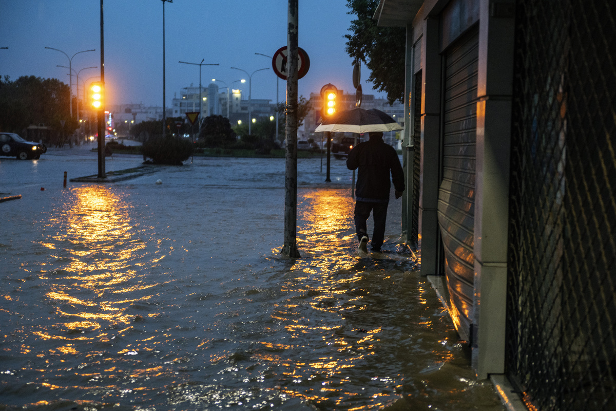 Ένας άνδρας προσπαθεί να διασχίσει πλημμυρισμένο δρόμο στον κόμβο των Παλαιών στο Βόλο, κατά τη διάρκεια της κακοκαιρίας Elias που πλήττει την περιοχή, Τετάρτη 27 Σεπτεμβρίου 2023. Σοβαρά τα προβλήματα που αντιμετωπίζει ο Βόλος αυτές τις ώρες καθώς τα πλημμυρικά φαινόμενα είναι έντονα. Ο περιφερειακός δρόμος του Βόλου δεν είναι προσβάσιμος σε πολλά σημεία, ενώ σοβαρά προβλήματα σημειώνονται στον κόμβο προς την Αγριά όπου οι δρόμοι έχουν γίνει ποτάμια, τα φερτά υλικά είναι πολλά και έχει διακοπεί κάθε κυκλοφορία. Πολλά αυτοκίνητα εγκλωβίζονται και μέσα στην πόλη του Βόλου, καθώς η ποσότητα νερού στους δρόμους είναι μεγάλη με τους οδηγούς να αδυνατούν να μετακινηθούν. ΑΠΕ-ΜΠΕ/ΑΠΕ-ΜΠΕ/ΧΑΤΖΗΠΟΛΙΤΗΣ ΝΙΚΟΛΑΟΣ