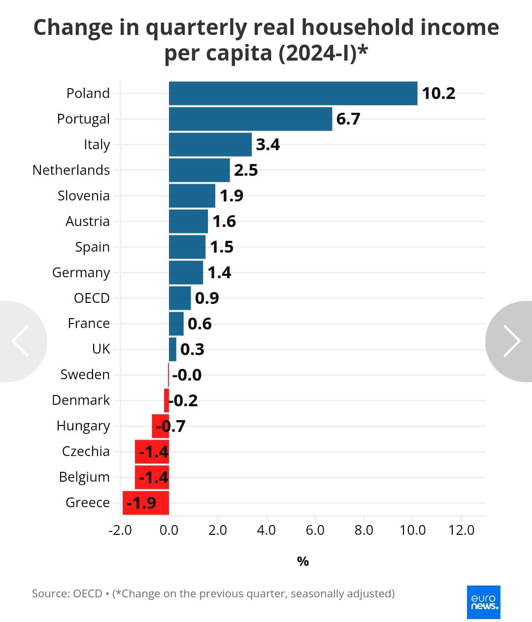 Β) Τα οφέλη της ανάπτυξης δεν φτάνουν στην κοινωνία. Σύμφωνα με τον ΟΟΣΑ, για το πρώτο τρίμηνο του 2024, τα στοιχεία δείχνουν ότι ενώ το κατά κεφαλήν ΑΕΠ στην Ελλάδα αυξήθηκε σχεδόν 0,9% σε σύγκριση με το 4ο τρίμηνο του 2023, το πραγματικό εισόδημα των νοικοκυριών μειώθηκε κατά 1,9%, σημειώνοντας τη μεγαλύτερη μείωση. Η Ελλάδα μάλιστα αποτελεί θλιβερή εξαίρεση μεταξύ των μελών του ΟΟΣΑ, όπου η μέση αύξηση του πραγματικού εισοδήματος των νοικοκυριών (0,9%) είναι πολλαπλάσια της αύξησης του κατά κεφαλήν ΑΕΠ (0,3%). Ακόμα και σε χώρες όπως η Ολλανδία, όπου το πραγματικό ΑΕΠ μειώθηκε το πρώτο τρίμηνο του έτους, το πραγματικό εισόδημα των νοικοκυριών αυξήθηκε.