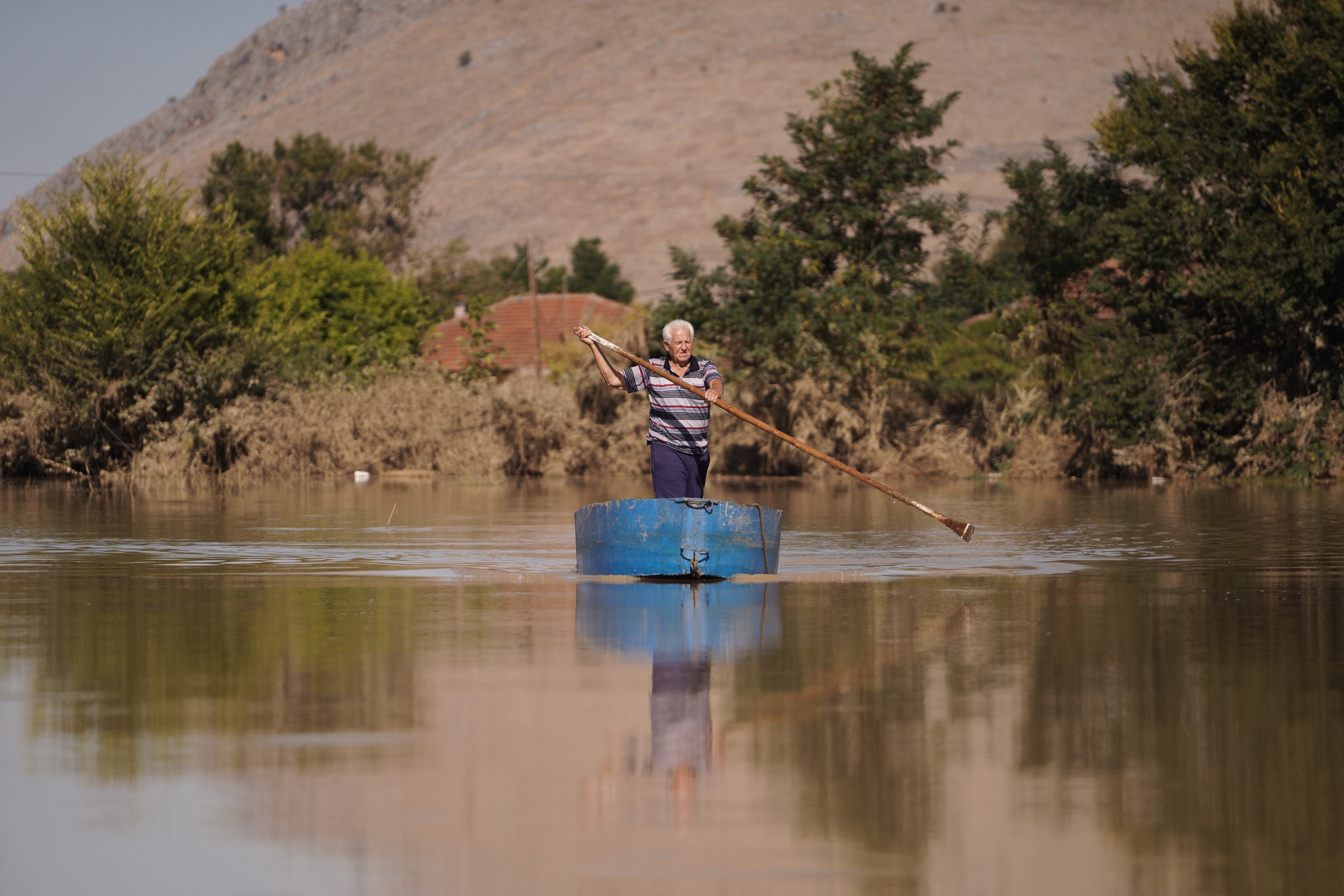 Kostas Tatsiopoulos, 80, arrives with his boat in the flooded village of Metamorfosi in Karditsa to carry supplies and medicine to the two residents who remained in the village after the floods caused by the storm Daniel, September 12, 2023. During the flood Mr. Tatsiopoulos rescued 17 people with his boat. / Ο Κώστας έσωσε 17 άτομα με τη βάρκα του από το χωριό Μεταμόρφωση Καρδίτσας κατά την διάρκεια των πλημμυρών που προκάλεσε η κακοκαιρία Daniel, 12 Σεπτεμβρίου 2023.