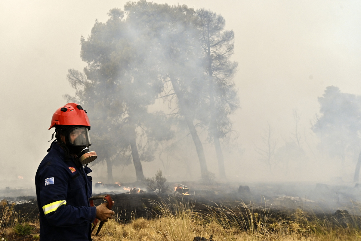 Πυροσβέστης επιχειρεί στην κατάσβεση πυρκαγιάς που ξέσπασε σε δασική έκταση στο Αμόνι Κορινθίας, Τρίτη 23 Ιουλίου 2024. Σύμφωνα με την Πυροσβεστική η φωτιά εκδηλώθηκε γύρω στις 17.46, βόρεια από την Μονή Αγίας Μαρίνης και δεν απειλεί άμεσα κάποιον οικισμό. Για την κατάσβεσή της κινητοποιήθηκαν 80 πυροσβέστες με 3 ομάδες πεζοπόρων τμημάτων της 6ης και 9ης ΕΜΟΔΕ, 25 οχήματα ενώ από αέρος συνδράμουν 5 αεροσκάφη και 2 ελικόπτερα. ΑΠΕ-ΜΠΕ/ΑΠΕ-ΜΠΕ/ΒΑΣΙΛΗΣ ΨΩΜΑΣ