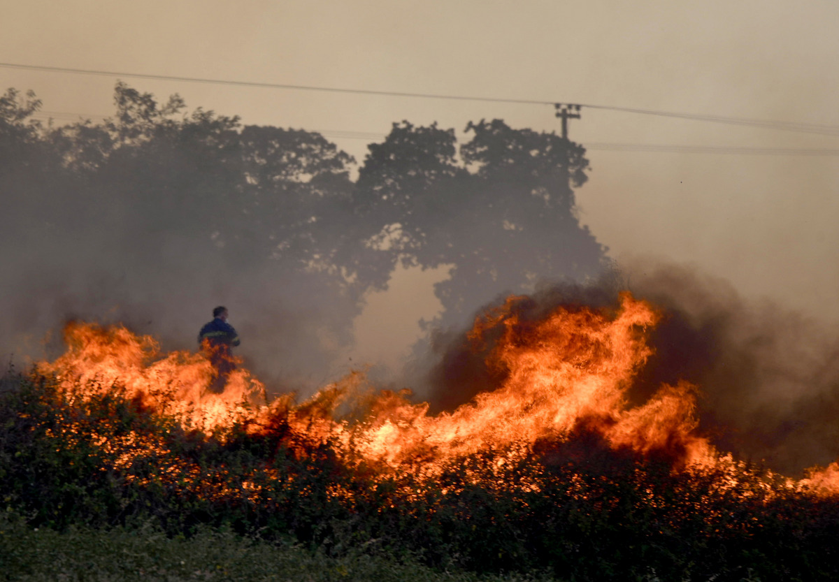 Πυροσβέστης επιχειρεί στην κατάσβεση της πυρκαγιάς στην περιοχή Άβαντα, στην Αλεξανδρούπολη, τη Δευτέρα 21 Αυγούστου 2023. Για τρίτη μέρα συνεχίζεται με αμείωτη ένταση η μεγάλη πυρκαγιά στην Αλεξανδρούπολη, η οποία, σύμφωνα με την Πυροσβεστική, είναι εξαιρετικά δύσκολο να ελεγχθεί, λόγω των ισχυρών ανέμων που πνέουν συνεχώς στην περιοχή. Το μεγάλο πρόβλημα εντοπίζεται σε δύο κύρια μέτωπα και κυρίως σε μια μεγάλη αναζωπύρωση που υπάρχει από το πρωί και εξελίσσεται τώρα βορειοδυτικά της Νίψας, πάνω από την Εγνατία Οδό. Στο μέτωπο αυτό η φωτιά καίει δάσος κοντά σε ανεμογεννήτριες, ενώ ο αέρας αλλάζει συνεχώς κατεύθυνση δημιουργώντας εξαιρετικά δύσκολες συνθήκες. Το δεύτερο μεγάλο μέτωπο είναι το ανατολικό, που εκτείνεται προς το χωριό Μοναστηράκι, νοτίως του Δορίσκου, που έχουν εκκενωθεί από χτες. Το μέτωπο προς τις παρυφές της Αλεξανδρούπολης από χτες είναι σε ύφεση. ΑΠΕ-ΜΠΕ/ΑΠΕ-ΜΠΕ/ΔΗΜΗΤΡΗΣ ΑΛΕΞΟΥΔΗΣ